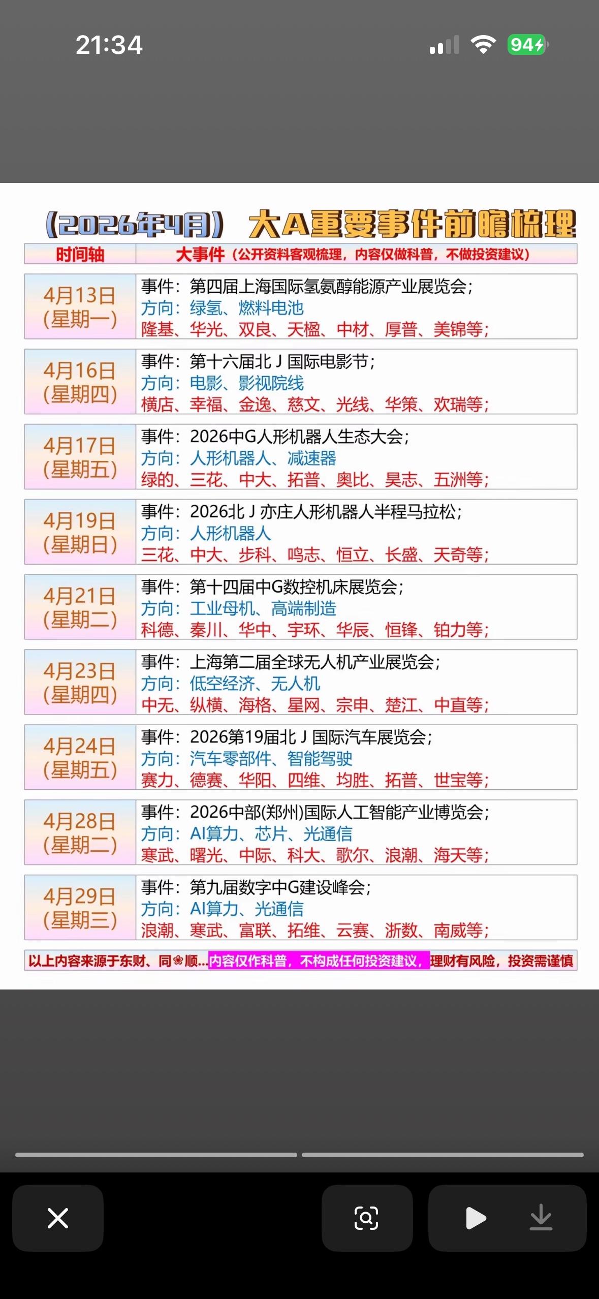 4月份大事件梳理,涵盖科技和商业。 2026年4月堪称科技与商业的“超级事件月”。科技方面,4月1 - 3日的第十四届储能国际峰会暨展览会规模宏大,有16万㎡展区、800 + 展商,还有150 + 新品全球首发。全球采购商对接专区有20 + 国际团到场,海外订单将集中官宣,构网型储能等技术成焦点。 商业上,4月1日半导体涨价潮落地,紫光国微、英飞凌等多家厂商产品涨价生效,模拟芯片等供需紧张加剧,利好国产替代赛道。4月7日短线交易监管新规实施,监管趋严让资金更青睐稳健品种,大金融板块有机会。这些事件对市场影响深远,值得密切关注。