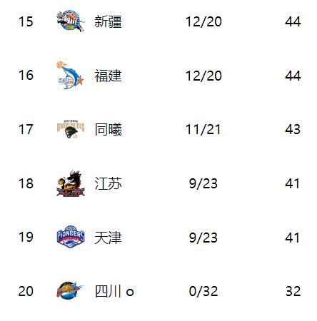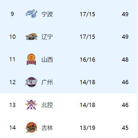 CBA第32轮比赛今晚全部结束,上一轮的前九名球队都赢球队,所以前九名没有变化,上一轮第十的山西队输给了上海,本轮排名降到第十一名,辽宁队赢下福建队后排名来到第十名。 季后赛附加赛12强争夺还是非常激烈,广州队14胜18负排名第十二名,北控队与广州队战绩相同,因为胜负关系排名第十三名。 后面的吉林队、新疆队、福建队也都有机会,他们与广州队相差仅有1-2场,第十七名的同曦队也有机会,但他们现在落后的有点多,他们现在仅11胜21负,距离广州队还有3场差距。 再后面的天津队和江苏队基本没有进入季后赛附加赛的机会了。 四川队已经创造了连败记录,就看他们本赛季能不能全负了,这样的记录估计真的是前无古人后无来者了。