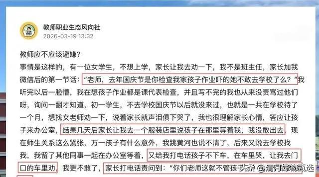 家长2次让去校外劝娃返校,女老师拒绝被扣帽子!网友:这是保命。 近日,一则关于家长两次要求教师到校外劝导学生返校的事件引发热议。事情的焦点是一位女老师坚决拒绝了家长的请求,并公开表达了自己的立场。她表示,作为教师,她有责任关心学生,但绝不能越界到校外去“劝返”,更不能因此被误解或“扣帽子”。不少网友纷纷支持女老师,认为她的做法是在“保命”,体现了教师职业的底线和自我保护意识。 事情回顾:某校一名学生因个人原因未按时返校,家长多次联系学校,希望老师能主动到校外进行劝导。女老师在权衡安全和职责后,选择拒绝了家长的请求。她担心校外劝导可能带来不可控的风险,也可能被误会为“越界行为”,影响自身的职业声誉和安全。 这一事件迅速在网络上引发讨论。许多网友认为,教师的职责是教育和管理校园内的学生,校外的事情应由家长或相关部门负责。老师私自出校外劝导学生,存在安全隐患,也容易引发纠纷甚至法律风险。网友评论:“老师不是万能的,不能被要求承担超出职责范围的风险。”“女老师拒绝‘扣帽子’是理智的自我保护,值得理解和支持。” 此外,这起事件也反映出当前家校沟通中存在的矛盾和压力。家长对孩子的关心无可厚非,但有时过度的期待和要求会给教师带来困扰。教师在履职过程中,需要明确职责边界,同时也需要社会和家长的理解与支持。 专家指出,面对学生的校外问题,学校应建立完善的应对机制,家长也应配合学校,共同为学生营造安全健康的成长环境。教师个人不宜单独承担校外劝导的责任,避免引发不必要的风险和纠纷。 总之,这位女老师的拒绝不仅是对自身安全和职业尊严的维护,也提醒我们要尊重教师的工作边界。教育是一项系统工程,需要家校社会多方协作,而非单靠教师一人承担所有压力。你怎么看这件事?欢迎留言分享你的观点。