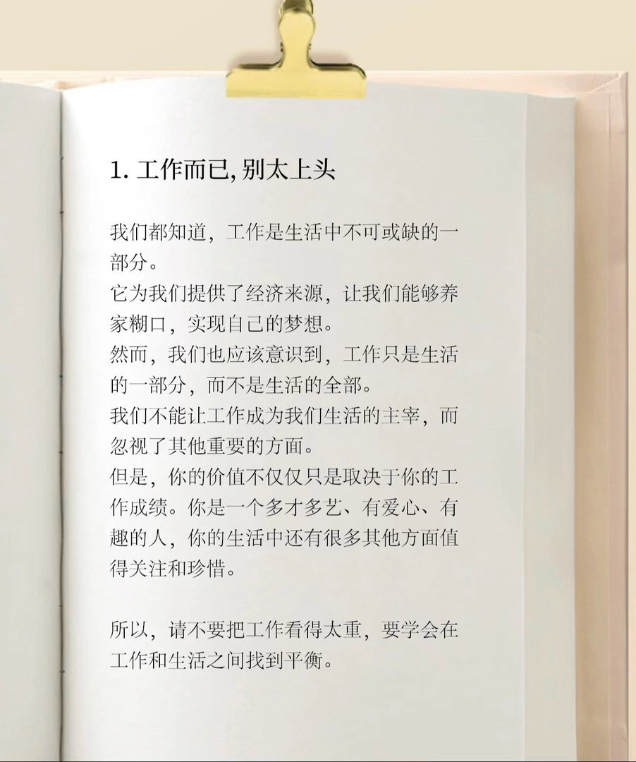 别成为除工作外什么都没有的人很多人把忙碌当勋章,把加班当上进,把生活压缩到只剩工位和归途。以为拼命抓住工作,就能抓住安全感,可到头来,工作撑不起全部自我,也填不满内心空洞。
