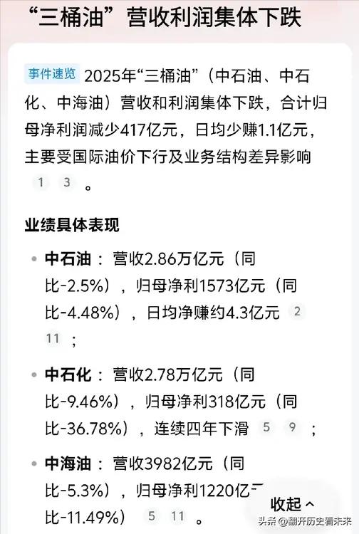 又一个关键的、好玩的消息来啦…… 根据相关统计报道:2025年“三桶油”(中石油、中石化、中海油)营收和利润居然集体大跌; 三桶油合计归母净利润减少417亿元,日均少赚1.1亿元! 那么我们来研究一下:三桶油为什么营收和利润会大跌呢?我个人认为的答案如下! 第一,油价是不是太便宜了、三桶油是不是太心软了,如果再继续涨点价的话,估计三桶油的利润就不会下滑了。 第二,我强烈怀疑现在用电车的人越来越多了、加油的人越来越少了,这也许是三桶油利润下滑的又一个关键原因。 第三,我们大家都知道:利润=营收—成本;如果营收没有大幅度增加的话,那么就是三桶油的运营成本太高了。 当然了,造成三桶油利润下降的原因还可能有很多,例如:办公楼建多了、工资和奖金发猛了、各种招待太多了等等。 最后我还是想说一句,既然三桶油都赚不到钱,甚至都会亏损;那么我个人强烈推荐自己来管理三桶油、我保证亏损了之后不找组织要补贴。 大家觉得呢?