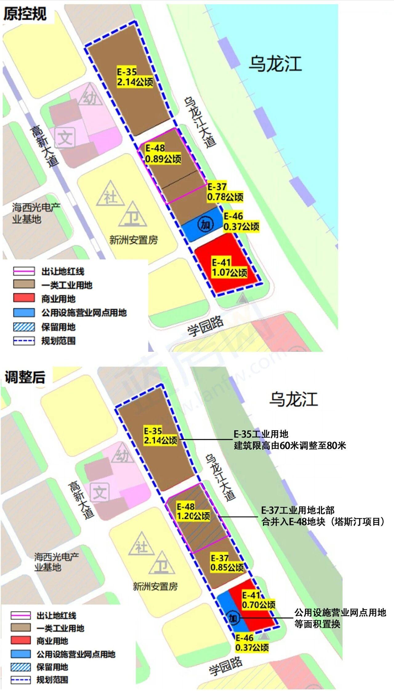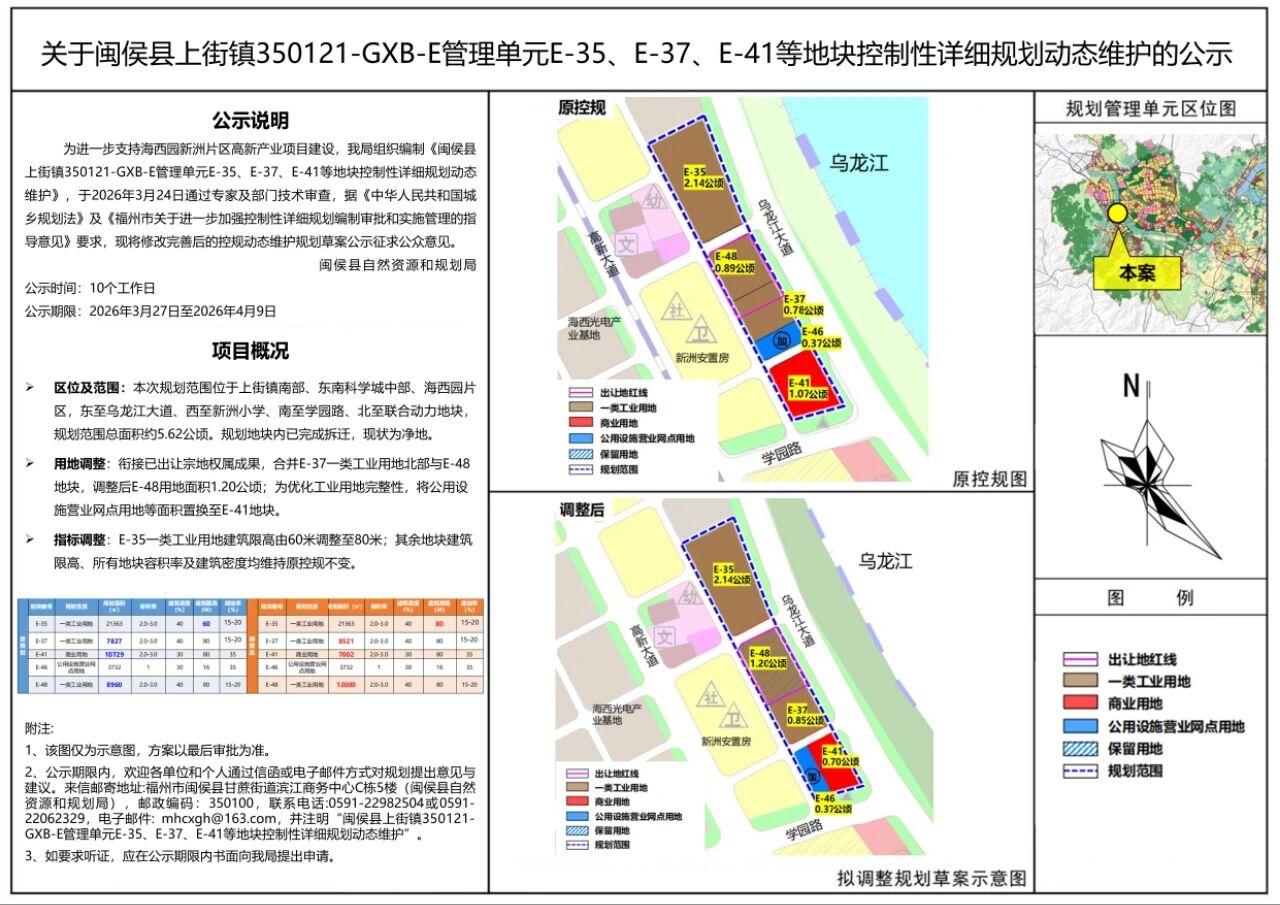 限高上调至80米!福州一滨江片区控规调整! 日前,上街镇高新区海西园新洲片区部分沿江地块(350121-GXB-E管理单元E-35、E-37、E-41等)的控规动态维护规划草案出炉。 其中E-35一类工业用地建筑限高由60米调整至80米;其余地块建筑限高、所有地块容积率及建筑密度均维持原控规不变。