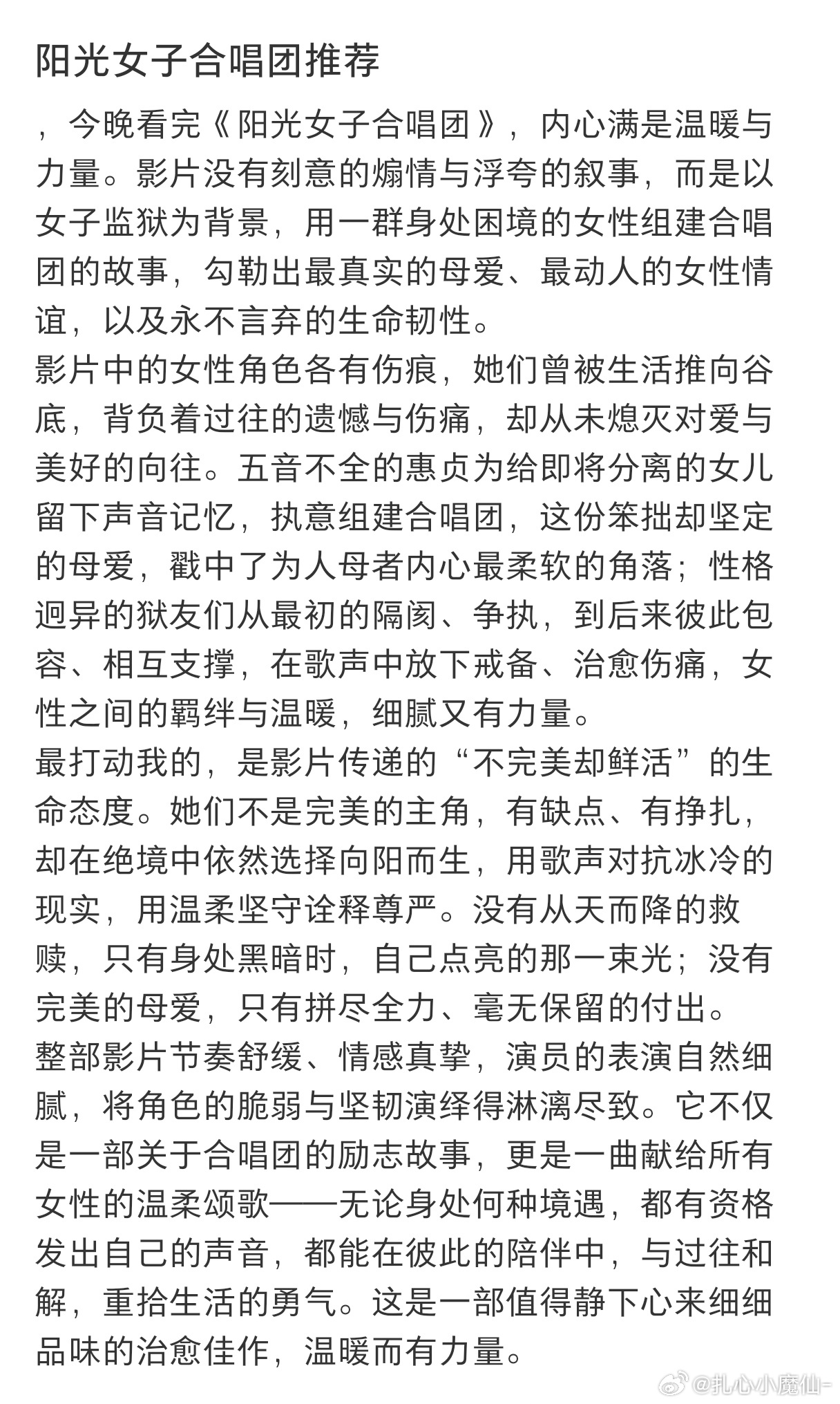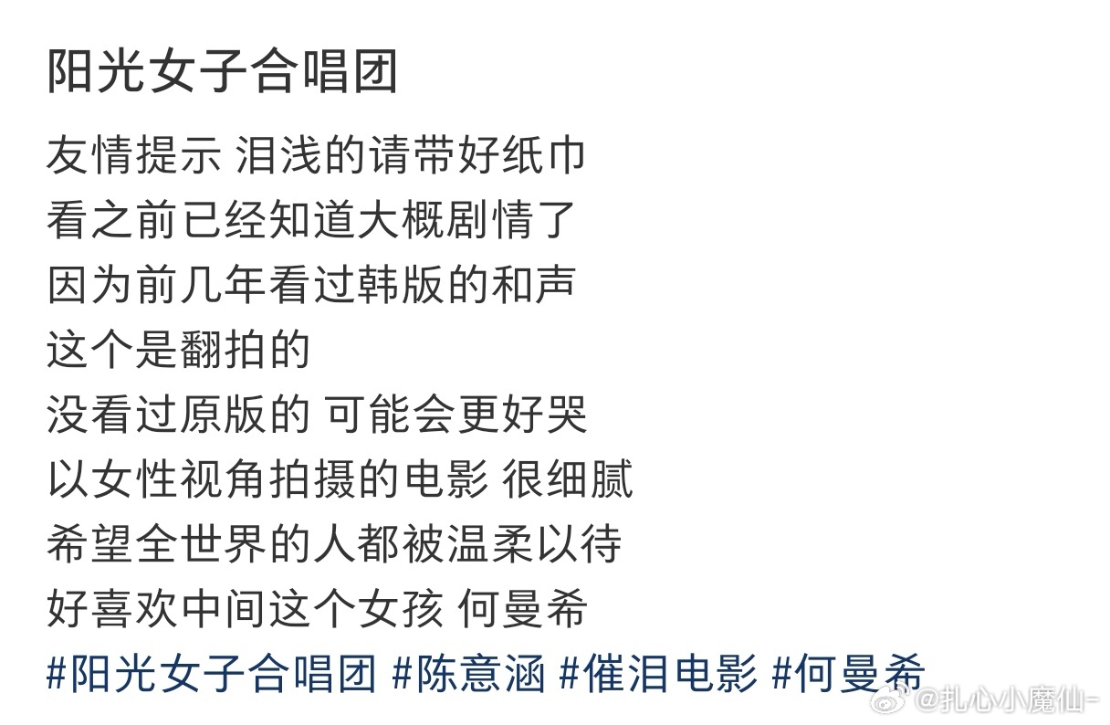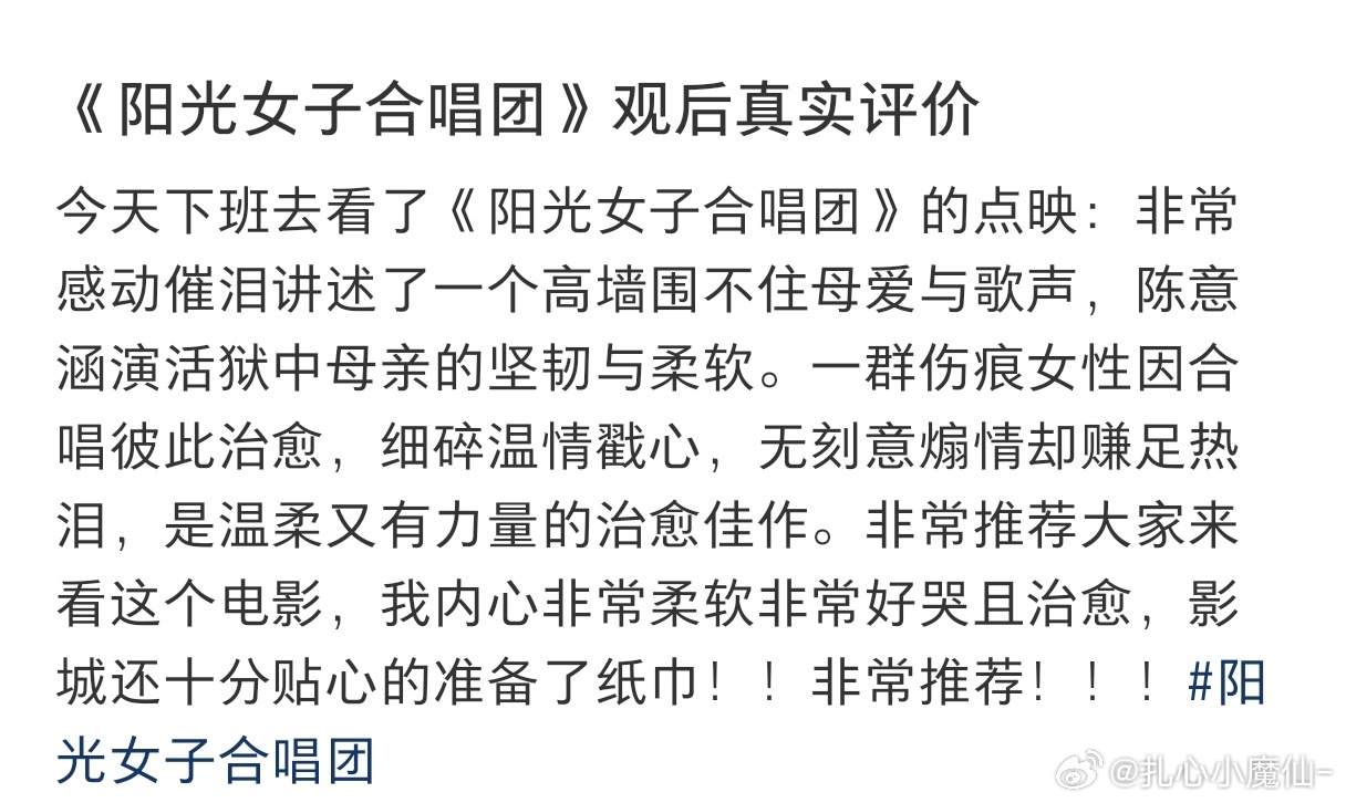 闫妮在首映一直传纸闫妮也在《阳光女子合唱团》首映现场。《阳光女子合唱团》一部后劲很大的电影😭大人的遗憾与心酸,孩子的纯真与美好,全都融在歌声里,温暖又戳泪。那些藏在岁月里的委屈、遗憾与伤痛,最后都被歌声和温柔化解,这大概就是这部片最动人的地方吧~
