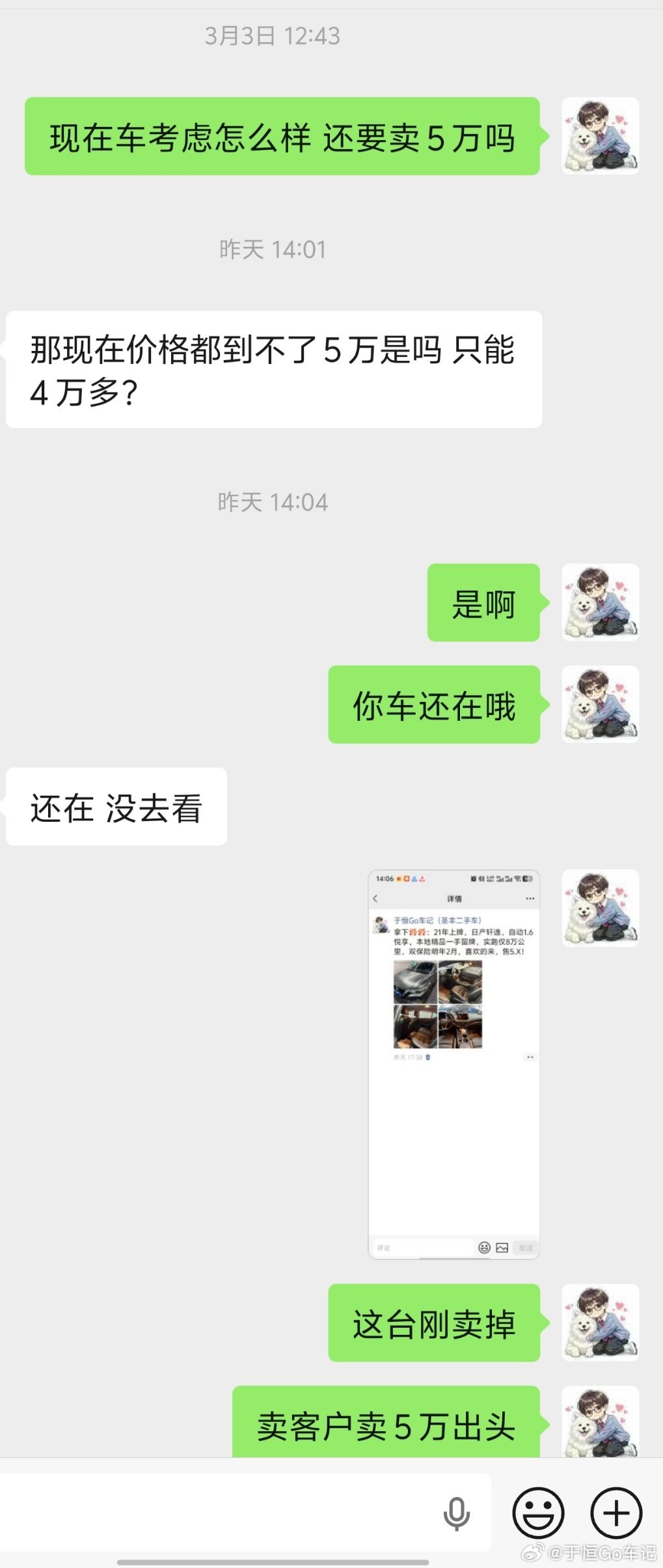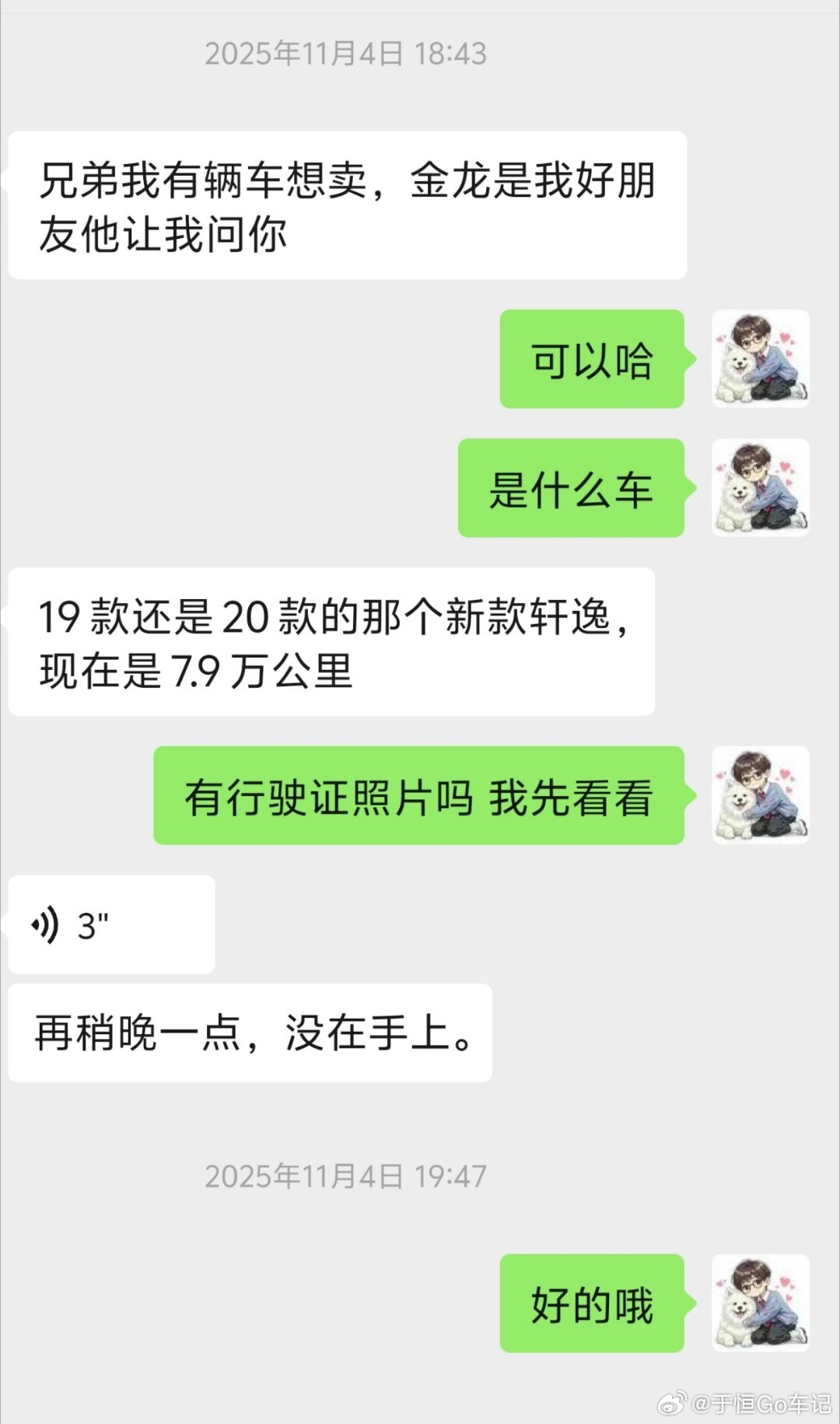 有时候收一台车跟进的周期真的很长一台20年上牌,目前8万公里的尼桑轩逸白色从25年11月,到26年1月,到这个月月初,再到昨天沟通今天晚上看车,价格一直嫌4万多太低了想卖上5万,我一开始就给他出4万出头的价格,到现在也是,结果晚上让我过去看车,我以为应该是能接受这个价了吧,结果等我看完车出完价后又说还是确定不了,还得跟家里面商量,这车左右两侧下边梁受损,过不了查博士检测,回来预计还得投资2000左右,合着成本估计得逼近4.5万了,随缘吧!于恒的二手车日常