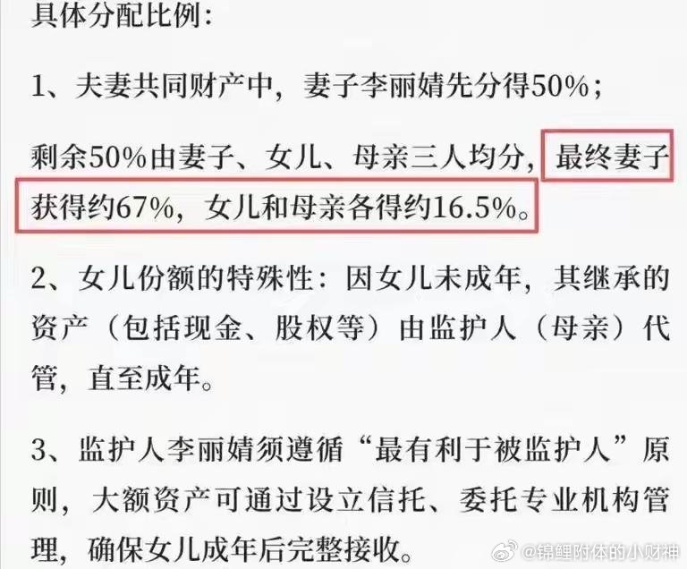 他走得太过仓促,中午运动后突发不适,送医抢救无效的消息传来,全网哗然。热搜之下,悼念的声音寥寥,更多的是追问与猜测:他是否再婚?遗产该如何分割?甚至有网传的继承比例被反复提及——女儿仅占16.5%,现任妻子拿走大头。这个看似冰冷的数字背后,是一个11岁孩子即将面对的现实:面对数亿资产,她不仅没有话语权,连属于自己的那份财产,都要面临“谁来代管、能否妥善保管”的难题。