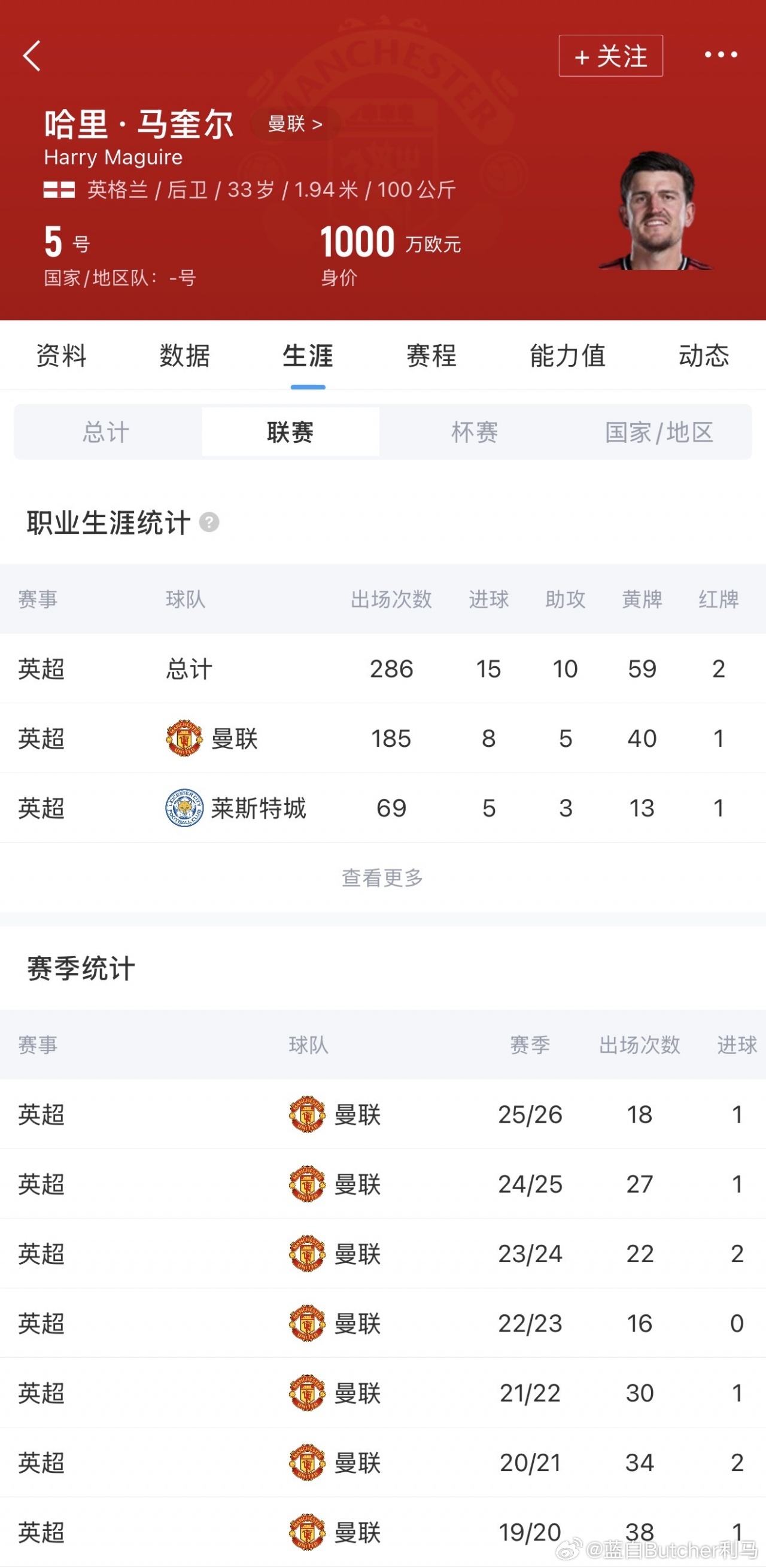 马奎尔2019年8700万欧元从莱斯特城转会曼联,目前共为曼联出场185次,随队斩获两座足总杯和一座联赛杯。英超体育英超联赛