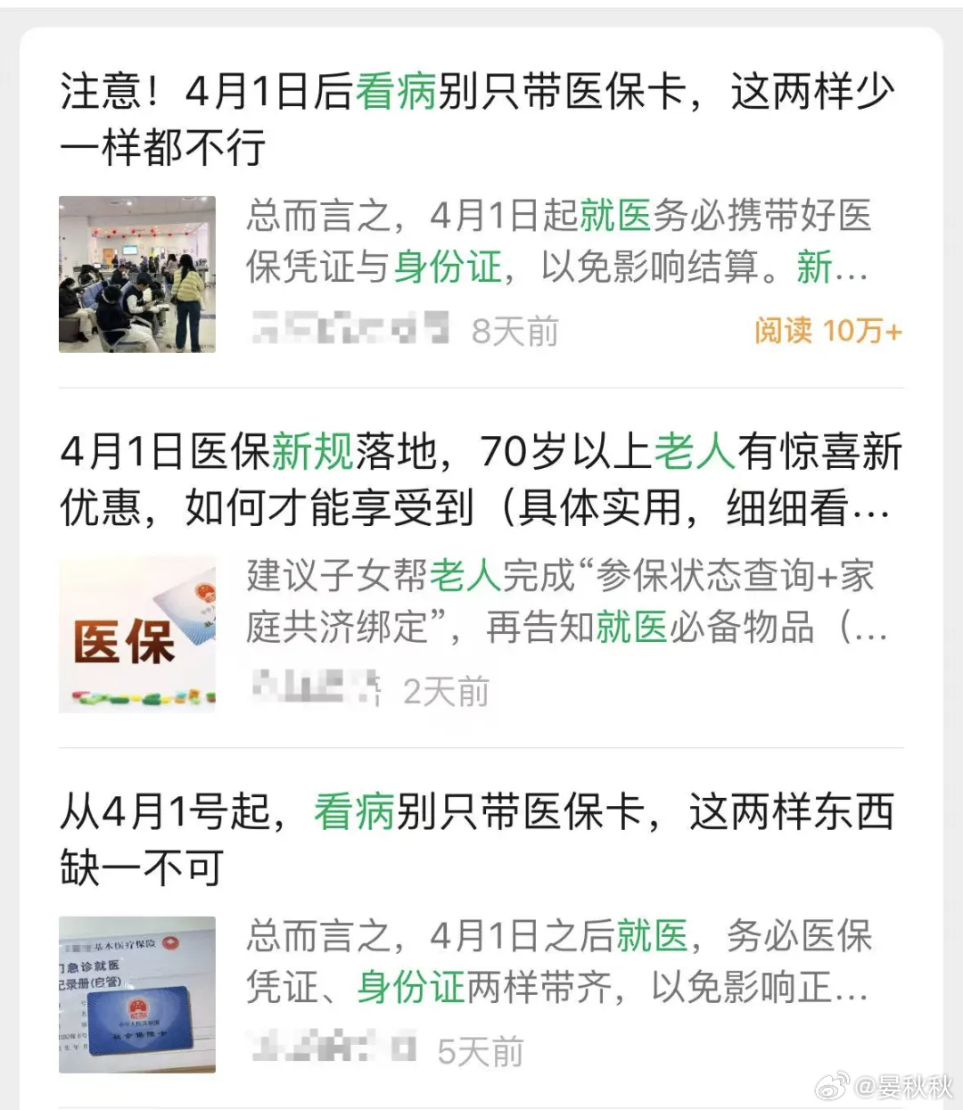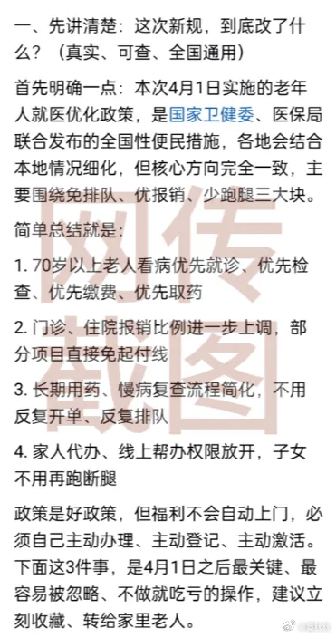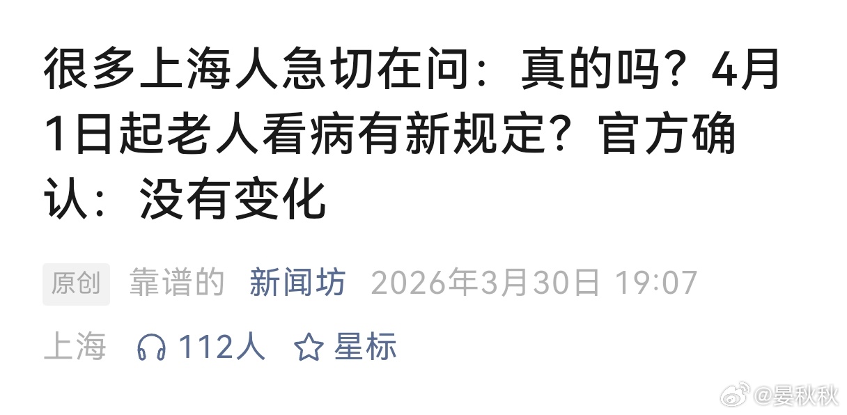 不少粉丝在后台询问,是不是从4月1日起,70岁以上老人看病,一定要带医保卡和身份证,不然没法报销?根据“新闻坊”求证上海市卫健委的消息,这是不折不扣的假消息。但在社交网络上,这种说法传得有鼻子有眼,甚至还有文章阅读量超过了10万,让许多老人信以为真。上海市卫健委医政处的工作人员,明确回应:近期上海根本没有发布过所谓的“老年人就医新政策”。这个谣言是怎么来的呢?仔细一看,它其实是把好几件“旧闻”和不同规定,拼凑在一起,制造出了“新政”的错觉。比如,文中提到的“70岁以上老人优先就诊”、“医保亲情账户”、“慢病长处方便民措施”等,这些都是上海实行了多年的政策,根本不是从今年4月才开始的新变化。而所谓的“医保结算备案”,主要指的是跨省异地就医时需要办理的手续,和我们在上海本地看病完全不是一回事。所以呢,最核心的三点请大家记牢?第一,老人就医,不需要提前在网上搞任何“备案”。第二,去医院,带好医保卡(或电子医保凭证)就行,身份证不是必须同时携带的。第三,医保报销的比例,近期也没有任何调整。网传70岁老人就医新规是假的4月起70岁老人就医新规落地消息不实晏秋秋