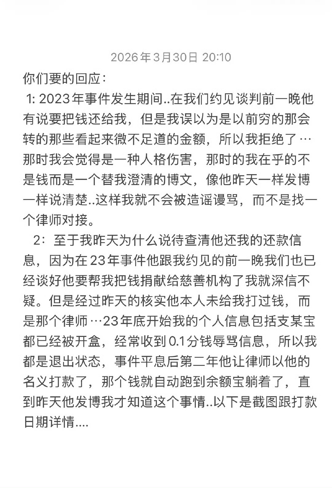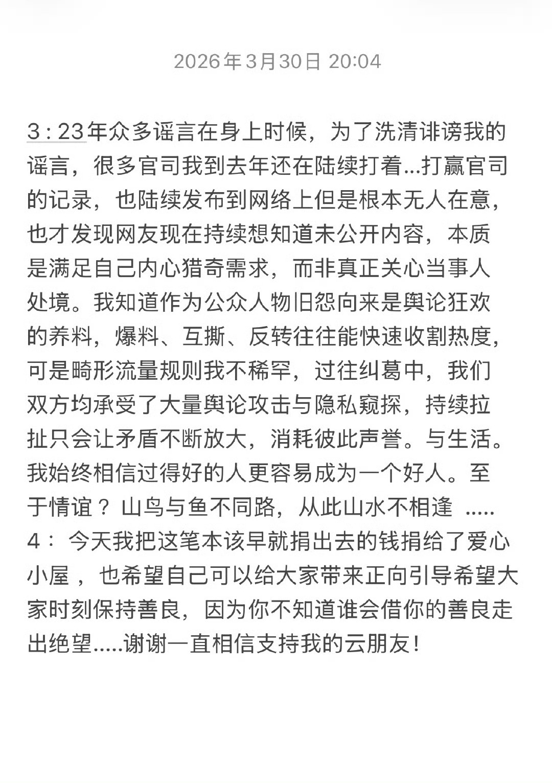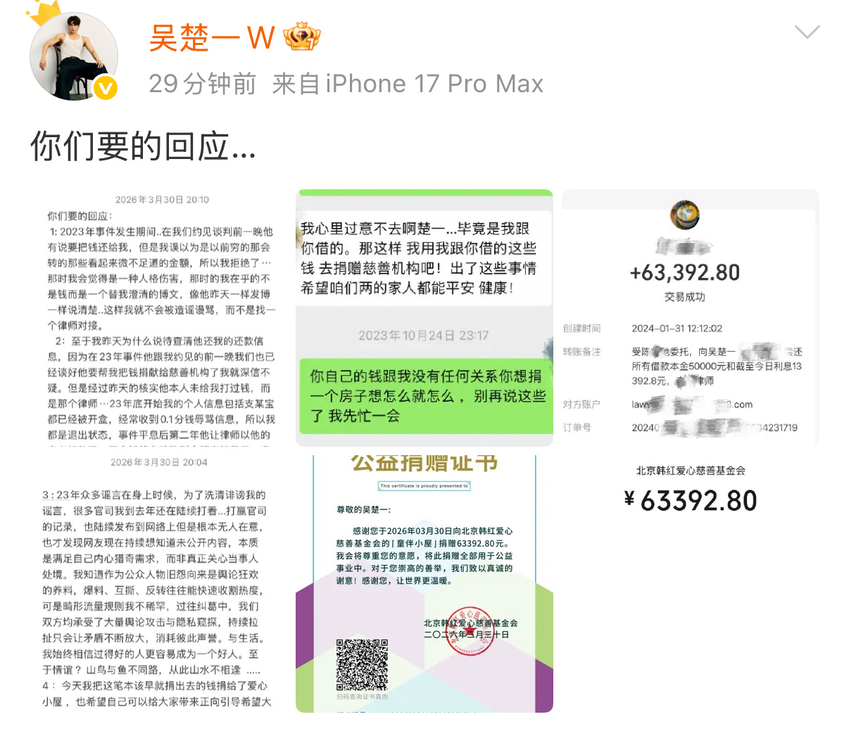 划重点:1. 陈牧驰提出还钱,吴楚一因诉求是澄清谣言而非钱款,拒绝了还款。2. 陈牧驰委托律师向吴楚一转账本息合计63392.8元。3. 吴楚一因个人信息泄露、账号长期未登录,直到2026年3月才知晓还款到账。4. 吴楚一将该笔钱款全额捐赠给韩红爱心慈善基金会。