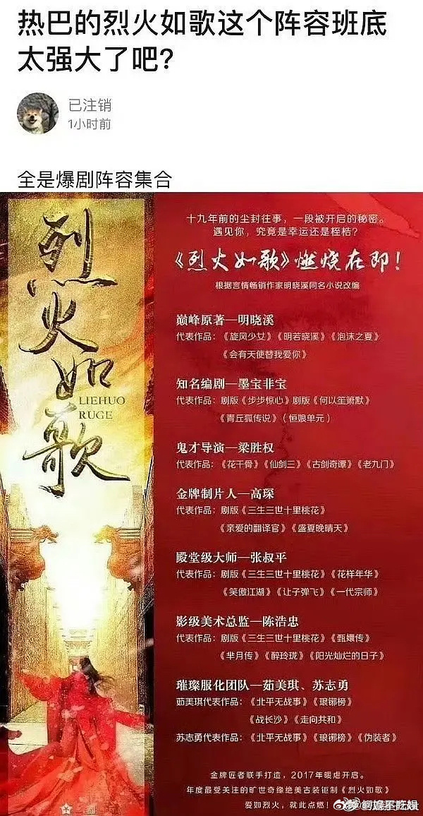 原来迪丽热巴的烈火如歌班底这么好,同期香蜜班底当时还是毒饼,杨紫还被抵制,结果两