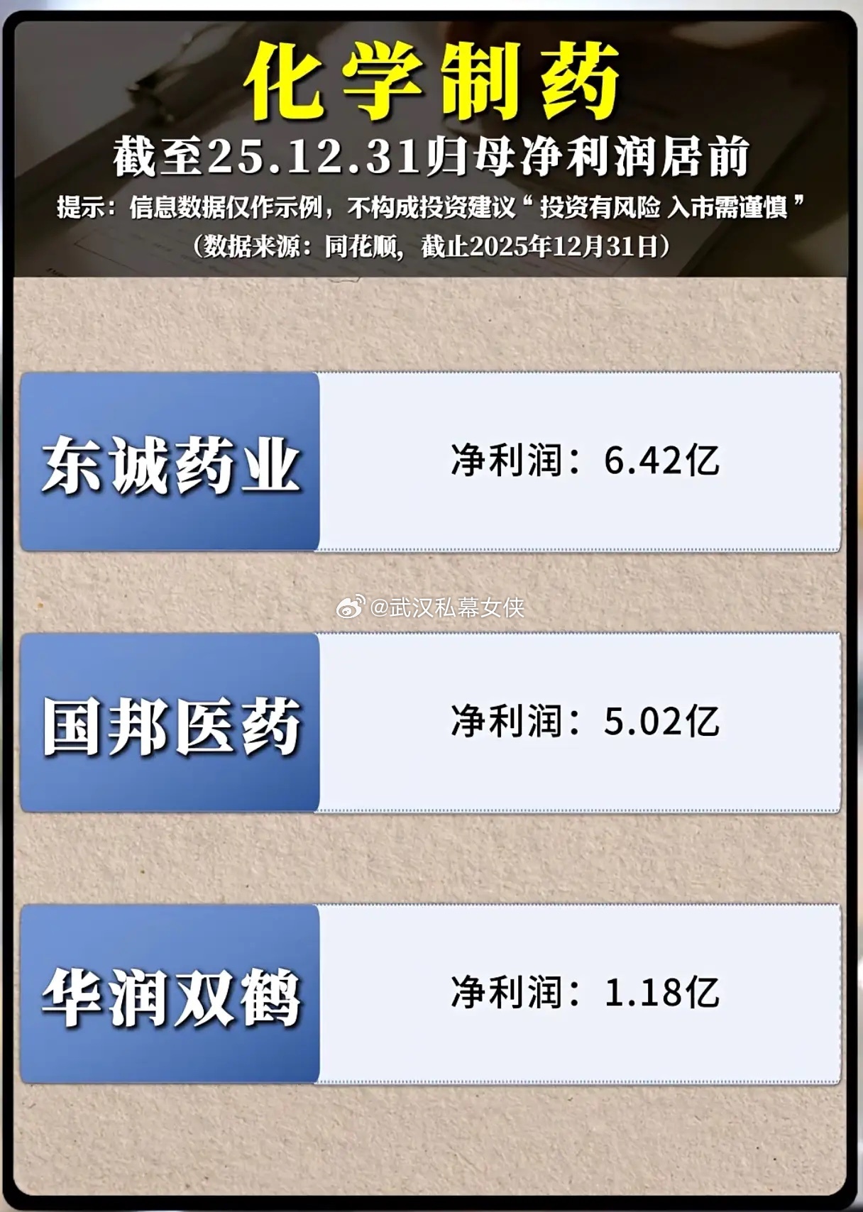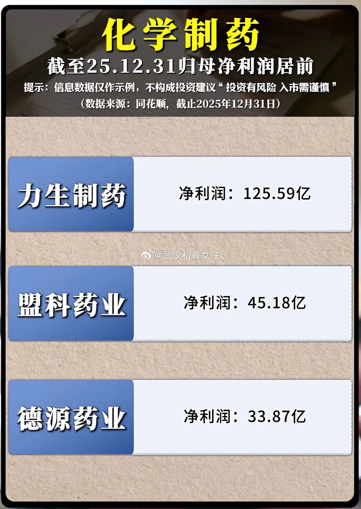 化学制药净利润榜火了!力生制药125亿领跑,谁才是真正的行业王者?当2025年化学制药行业归母净利润榜单出炉,市场瞬间沸腾:力生制药以125.59亿的净利润断层领跑,盟科药业、德源药业紧随其后,而恒瑞、复星等老牌药企却仅以21.69亿并列第四。这份榜单不仅刷新了行业认知,更戳中了无数投资者的疑问:化学制药的盈利逻辑,真的变天了吗?从榜单数据来看,行业分化堪称“冰火两重天”。力生制药以超百亿净利润一骑绝尘,是第二名盟科药业的近3倍,更是华润双鹤的百倍有余,这种断层式领先,背后是其在特色原料药、仿制药领域的极致成本控制与渠道优势。而盟科药业、德源药业等新锐企业的崛起,也印证了创新药商业化落地的爆发力——盟科药业的抗耐药菌药物管线持续放量,德源药业在内分泌领域的深耕,让它们在细分赛道实现了利润突围。反观恒瑞、复星等传统龙头,虽仍保持稳定盈利,但增速放缓,也折射出创新药研发投入周期长、商业化压力大的行业痛点。最新行业动态更让这份榜单充满看点:2026年初,国家医保局启动新一轮化学药集采谈判,力生制药的核心品种成功中标,进一步巩固了市场份额;同时,盟科药业的新一代抗菌药MRX-4获批上市,填补了国内耐药菌治疗空白,直接带动业绩增长。技术层面,AI辅助药物研发成为行业新引擎,德源药业借助AI优化原料药合成工艺,生产成本下降15%,净利润率大幅提升;恒瑞医药也加速布局AI制药,推动创新药研发周期缩短30%,为后续业绩反弹埋下伏笔。化学制药行业从来不是“强者恒强”的零和博弈,而是技术迭代与商业化能力的综合较量。力生制药的领跑,是传统仿制药企业“以量换利”的极致演绎;盟科药业的崛起,是创新药企业“技术破局”的生动样本;而恒瑞们的坚守,则是行业长期发展的底气所在。对于投资者而言,榜单只是起点,真正的机会藏在集采政策的红利、AI技术的赋能、创新管线的落地之中。