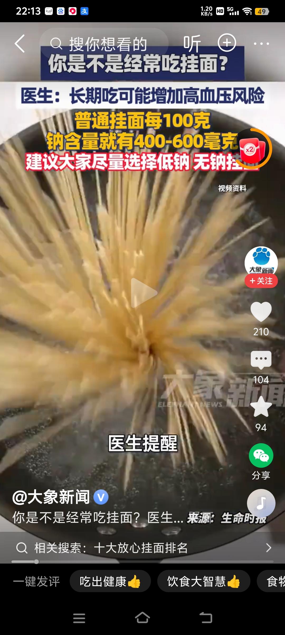 不要长期吃挂面了! 医生提醒,长期吃挂面增加患高血压的风险。 一般挂面100克里面含钠就有400到600毫克,部分挂面100里面甚至含钠达到1200毫克。 人如果摄入钠过多,首先是增加患高血压的风险,严重者损伤人的肾脏。 为了自己的健康,以后还是要少吃挂面。
