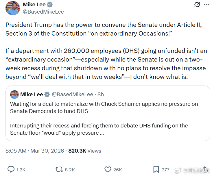 参议员迈克·李:特朗普总统根据宪法第二条第三款,有权在“特殊情况下”召集参议院。