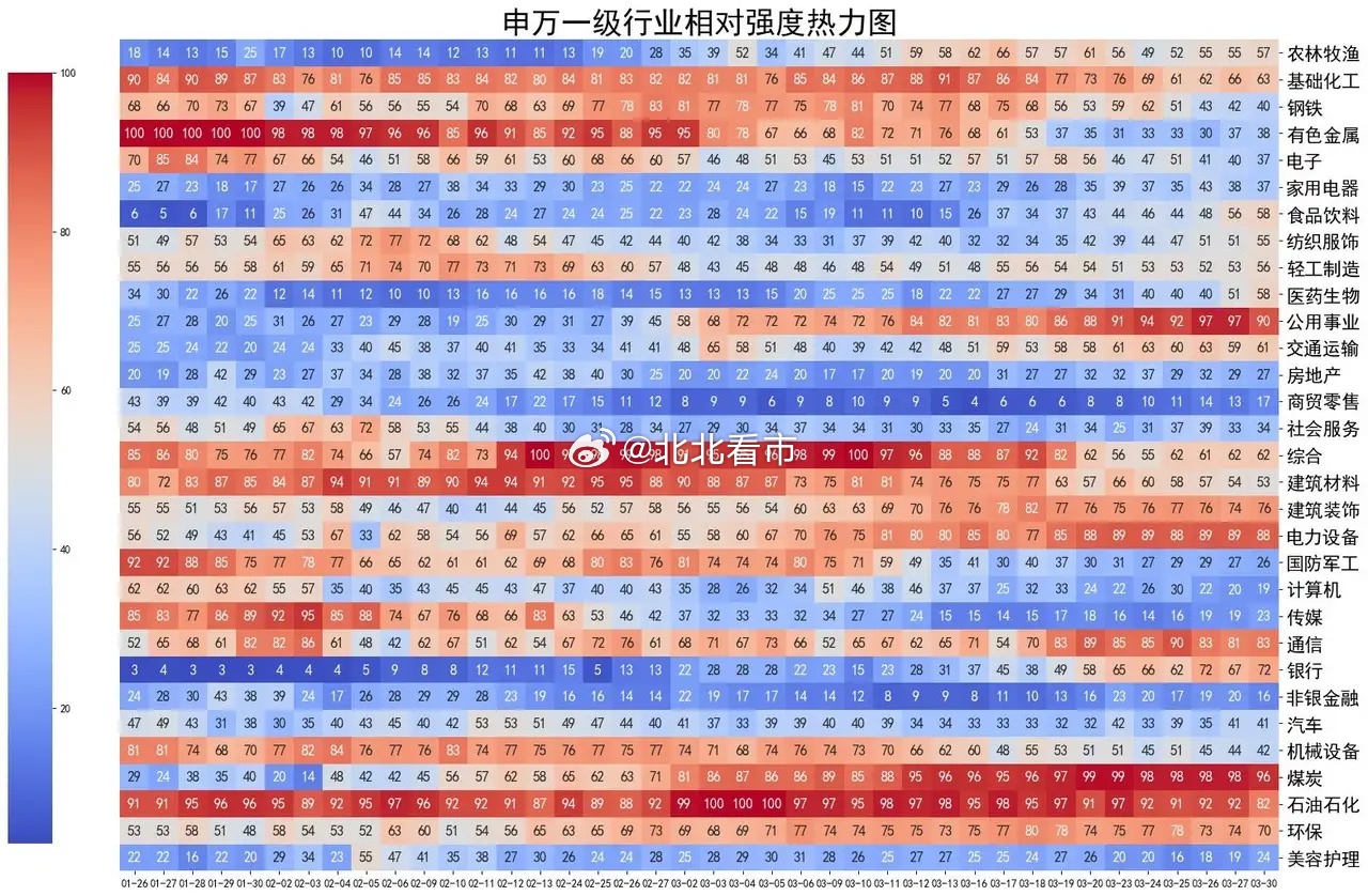 有色金属、钢铁、基础化工,一起位于榜单前列
