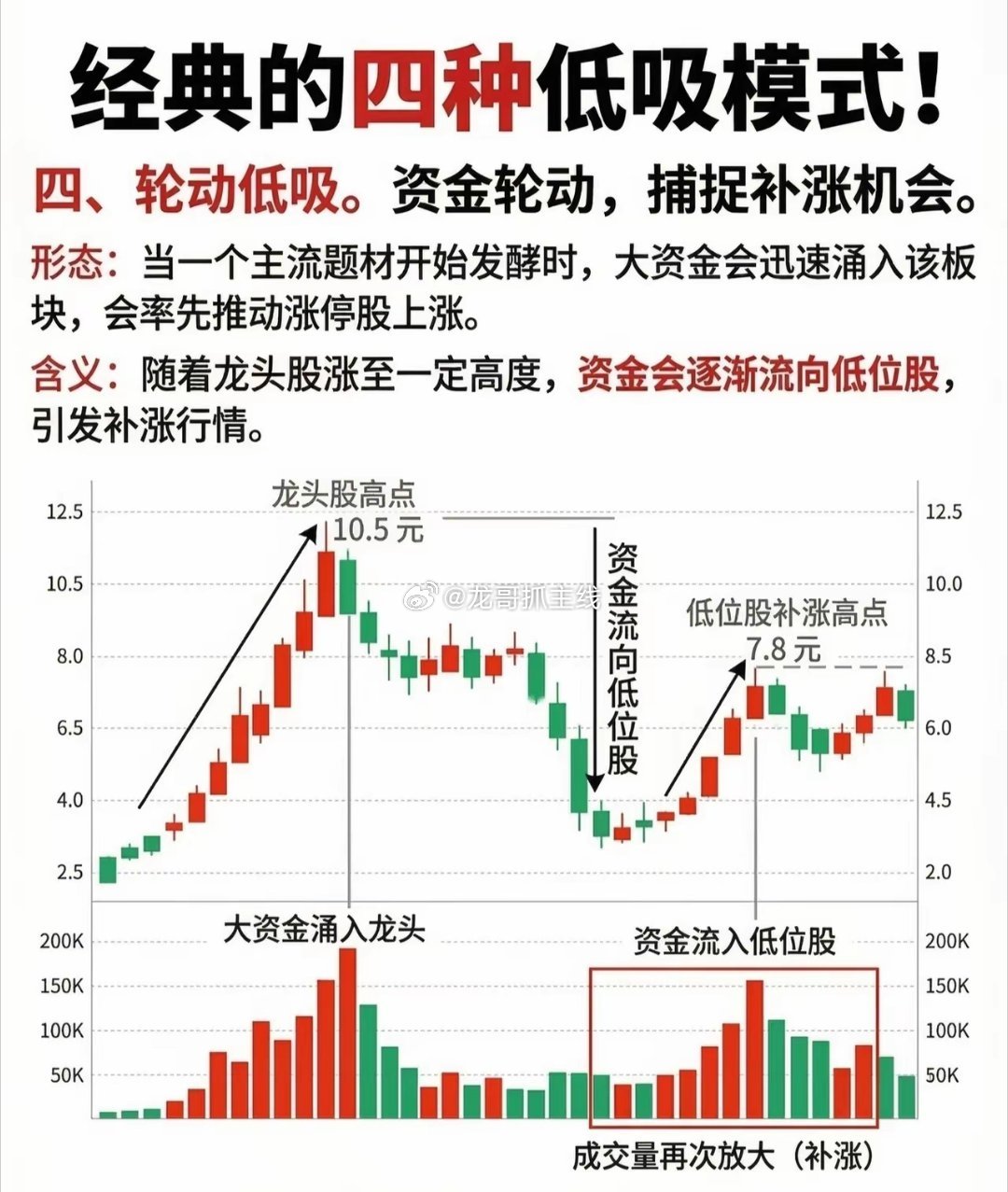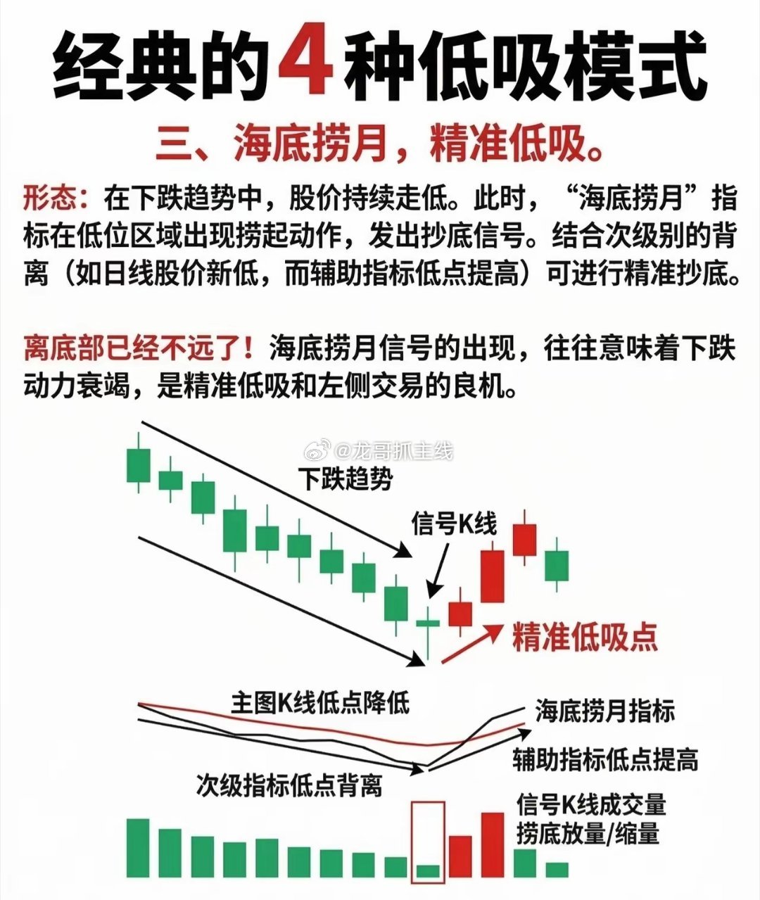 经典的四种低吸模式(收藏学习)一、趋势低吸——把握大势,精准抄底核心逻辑:依托日K线的趋势延续性,在上升趋势中捕捉回调后的低吸机会。最佳时机:右侧突破后的左侧回踩(即股价突破前期压力位后,回踩原阻力位转化为的支撑位时介入)。信号形态:主流题材龙头股首次出现分歧时,若出现「首阴冲高回落」「长上引线」「断板空中加油」等K线形态,即为低吸信号。图表解析:- 股价先以“放量突破”的姿态突破前期高点(右侧突破),随后进入“缩量回调”阶段,回踩至原阻力位转化的支撑位。- 回调过程中出现「长下引线」「首阴长下引线回踩支撑位」「空中加油形态」,且低吸点成交量明显缩小(缩量回调验证抛压衰竭),之后股价往往再次启动上行。二、套利低吸——冰点买入,挖掘低位潜力股定义:当股票下跌时,及时以低价介入,待反弹时卖出,赚取短期差价。关注方向:低位板块(前期热门板块回调至低位,具备“先回调、回调幅度大”的特点,更易率先反弹)。图表解析:- 前期热门板块经历“大幅回调”至“冰点”(低价区),此时成交量为地量(冰点买入信号)。- 股价在低位企稳后,伴随“反弹成交量放大”展开反弹,可于反弹时逢高卖出,完成套利。三、海底捞月——精准低吸,左侧交易良机形态逻辑:下跌趋势中,股价持续走低,但“海底捞月”指标在低位区域出现“捞起”动作(发出抄底信号)。结合次级别背离(如日线股价创新低,辅助指标低点却抬高),可精准判断底部。关键信号:- 主图K线呈现“低点降低”的下跌趋势,但辅助指标(如MACD、KDJ等)“低点提高”,形成次级指标背离(预示下跌动力衰竭)。- 信号K线出现时,成交量为“捞底放量/缩量”(缩量更优,验证抛压枯竭),此时的“精准低吸点”是左侧交易的绝佳时机。四、轮动低吸——资金轮动,捕捉补涨机会形态逻辑:主流题材发酵时,大资金优先涌入推动龙头股上涨;当龙头股涨至一定高度,资金会逐渐流向低位股,引发补涨行情。图表解析:- 第一阶段:大资金涌入主流题材龙头,推动股价从低位(如2.5元)飙升至高点(如10.5元),此阶段成交量持续放大。- 第二阶段:龙头高位震荡,资金开始“流向低位股”(成交量再次放大),低位股随之启动补涨,最终形成“低位股补涨高点”(如7.8元)。