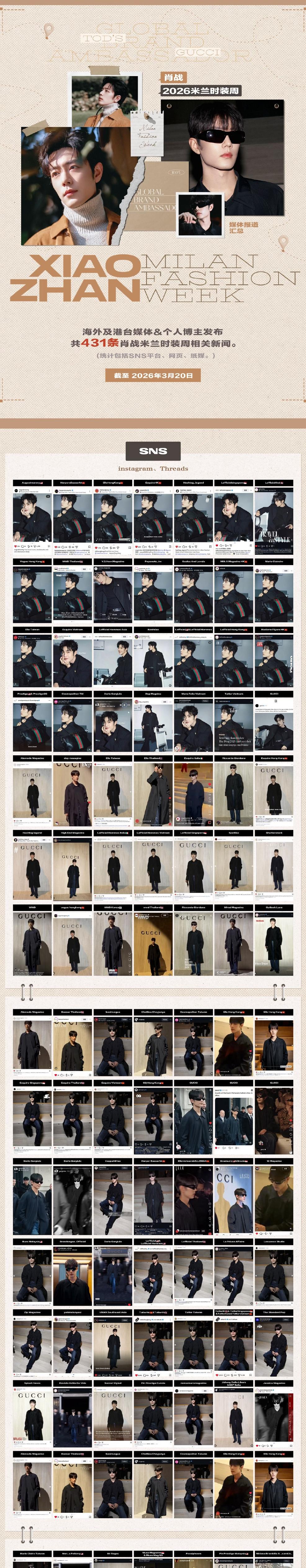肖战出席今年3月的米兰时装周,到3月20日为止,海内外媒体和博主发了431条相关