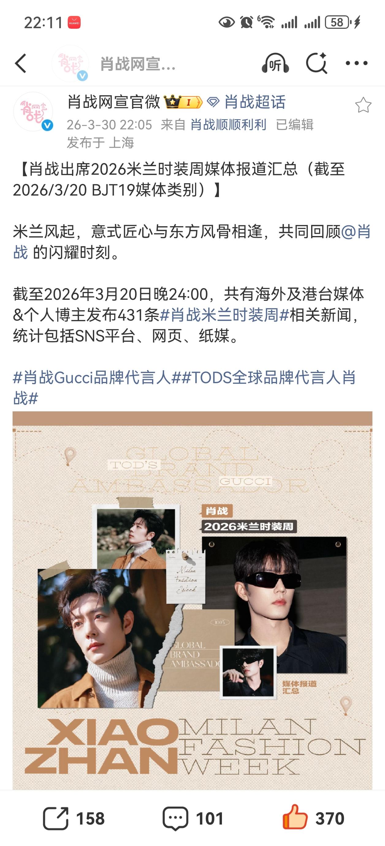 肖战出席今年3月的米兰时装周,到3月20日为止,海内外媒体和博主发了431条相关消息[赞][赞][赞]
