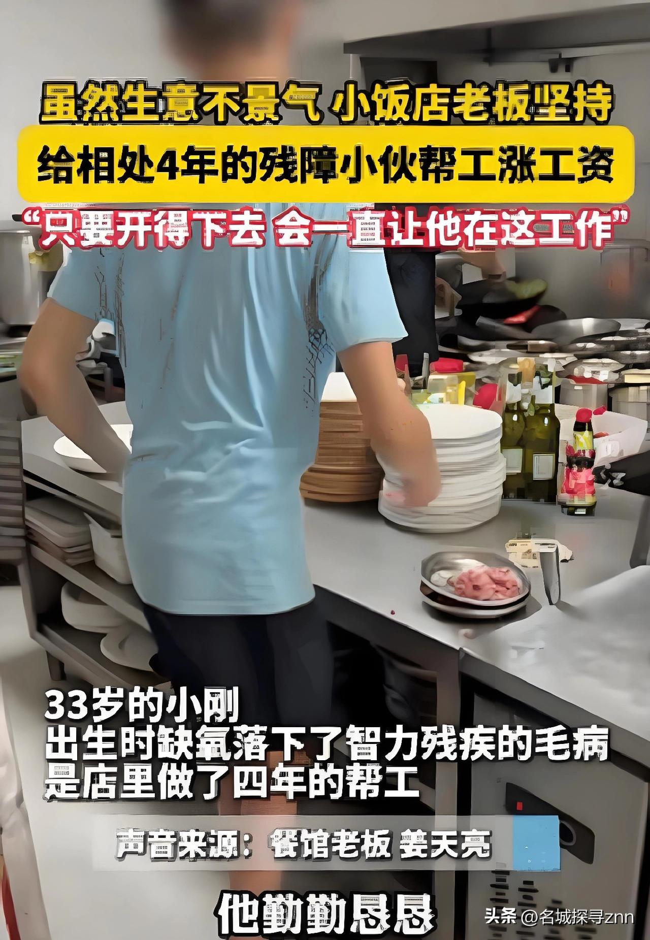浙江,一饭馆老板收留了一名残疾小伙,眼看店里生意不好,老板不但没有辞退小伙,反而还给他涨工资,小伙如今月薪2800,很多人表示不理解,然而老板一番话让人泪目。 33岁的小刚,出生时因缺氧导致智力发育迟缓,生活能自理,却很难像正常人一样表达复杂情绪,更别说在竞争激烈的职场找到一席之地。 四年前,他流浪到浙江这家小饭馆,站在门口徘徊许久,饿了就蹲在路边啃干硬的馒头,饭馆老板姜天亮当时刚接手小店,看他这副模样,心里不是滋味,喊住他问要不要留下来帮忙,管吃管住,每月给1000多块钱。小刚愣了半天,才从喉咙里挤出一个含糊的“要”字,这一留,就是四年。 店里的空间不大,后厨更是拥挤,姜天亮既要掌勺当主厨,又要采购食材,妻子则包揽了收银和保洁的所有活计,夫妻俩每天从早忙到晚,几乎没有休息时间。 小刚干的都是杂活,择菜、洗碗、擦桌子、整理餐具,这些看似简单的活儿,他却做得格外认真。他记不住复杂的指令,就把每一步都刻在脑子里,每天提前半小时到店,把食材按类别分好,碗筷洗得干干净净,连灶台边角的油污都不会放过。 有一次,店里来了一桌挑剔的客人,催菜催得急,姜天亮在灶台前忙得不可开交,妻子又被顾客围着结账,小刚主动走到后厨门口,笨拙地帮着递盘子、擦灶台,动作不算熟练,却让夫妻俩能稍微喘口气。 生意不好是从去年下半年开始的。周边接连开了几家连锁快餐店,价格更低,环境更整洁,不少老顾客都被分流走了。小饭馆的营收一天不如一天,有时候一天下来,净利润还不够支付房租和食材成本。朋友和亲戚都劝姜天亮,赶紧缩减开支,辞退小刚,这样每个月能省下一千多块钱,压力能小不少。 姜天亮每次都只是摇摇头,不说话。他不是不懂生意难做,也不是不知道节省成本,但他一想到小刚被辞退后,又要回到街头流浪,就怎么也狠不下心。他知道,这个社会对残障人士并不友好,小刚找不到其他工作,他的工资是家里唯一的收入来源,一旦没了这份工作,他连饭都吃不上。 上个月发工资的时候,姜天亮把小刚叫到身边,从抽屉里拿出一个厚厚的信封,递到他手里。小刚接过信封,捏了捏,感觉比往常厚了不少,他抬头看着姜天亮,眼里满是疑惑。姜天亮笑着说,从这个月开始,他的工资涨到2800了,比原来多了一倍还多。小刚愣了很久,才慢慢反应过来,嘴角微微上扬,露出了难得的笑容,这是他四年来第一次笑得这么开心。 消息传到网上,很多网友都表示不理解。有人说,老板自己都快揭不开锅了,还给残疾人涨工资,这不是傻吗?也有人说,这是老板在作秀,想靠这个博眼球,吸引顾客来吃饭。面对这些质疑,姜天亮没有过多解释,直到有人采访他,他才说出了藏在心里的话。 姜天亮说,他开饭馆不是为了发大财,就是想混口饭吃,能让一家人安稳过日子。小刚跟着他干了四年,勤勤恳恳,从来没有给店里惹过麻烦,反而帮了他们很多忙。他说,自己也是从苦日子里过来的,知道没有工作、没有收入的滋味有多难受。他说,只要这家饭馆还能开下去,就会一直让小刚在这里工作,不会因为生意不好就把他赶走。 他还说,人活着,不能只看钱,还要讲点良心。小刚虽然身体有缺陷,但他用自己的方式努力生活,努力工作,他值得一份尊重,一份稳定的收入。他还表示,自己的生意虽然不好,但还能撑下去,只要他有一口饭吃,就不会让小刚没饭吃。 这番朴实的话,让无数网友红了眼眶。大家这才明白,姜天亮不是傻,也不是作秀,而是真的善良,真的有担当。在这个利益至上的时代,这样的善良显得格外珍贵,也格外动人。 老顾客们得知老板的故事后,纷纷特意来到店里吃饭,支持老板的生意。他们说,这样的老板,值得大家支持。不少网友也专门跑到这家小饭馆,就为了尝一尝老板做的菜,和小刚打个招呼,夸他能干。店里的生意慢慢有了起色,虽然不如以前红火,但至少能维持下去,姜天亮和妻子的脸上,也露出了久违的笑容。 小刚也更卖力了,他把店里当成了自己的家,每天都把店里收拾得干干净净,对待顾客也格外热情。有顾客逗他,问他工资涨了高不高兴,他会用力点头,然后露出憨厚的笑容。很多老顾客都喜欢和他聊天,说他是店里的“活宝”,也是店里最温暖的存在。 这四年里,姜天亮和妻子从来没有嫌弃过小刚,反而把他当成家人一样对待。天冷了,给他加衣服;生病了,带他去看医生;吃饭时,总会给他留一份好吃的。小刚虽然不会说太多话,但他心里清楚,姜天亮和妻子是对他最好的人。他每天都会用自己的方式回报他们,择菜、洗碗、擦桌子,每一件小事都做得尽心尽力。 这个故事在网上传开后,引发了很多人的讨论。有人说,小刚是幸运的,遇到了姜天亮这样的好老板;也有人说,姜天亮是伟大的,他用自己的行动诠释了什么是善良,什么是担当。更多人感慨,在这个世界上,总有一些人,用自己的微光,照亮别人的路。 各位读者你们怎么看?欢迎在评论区讨论。