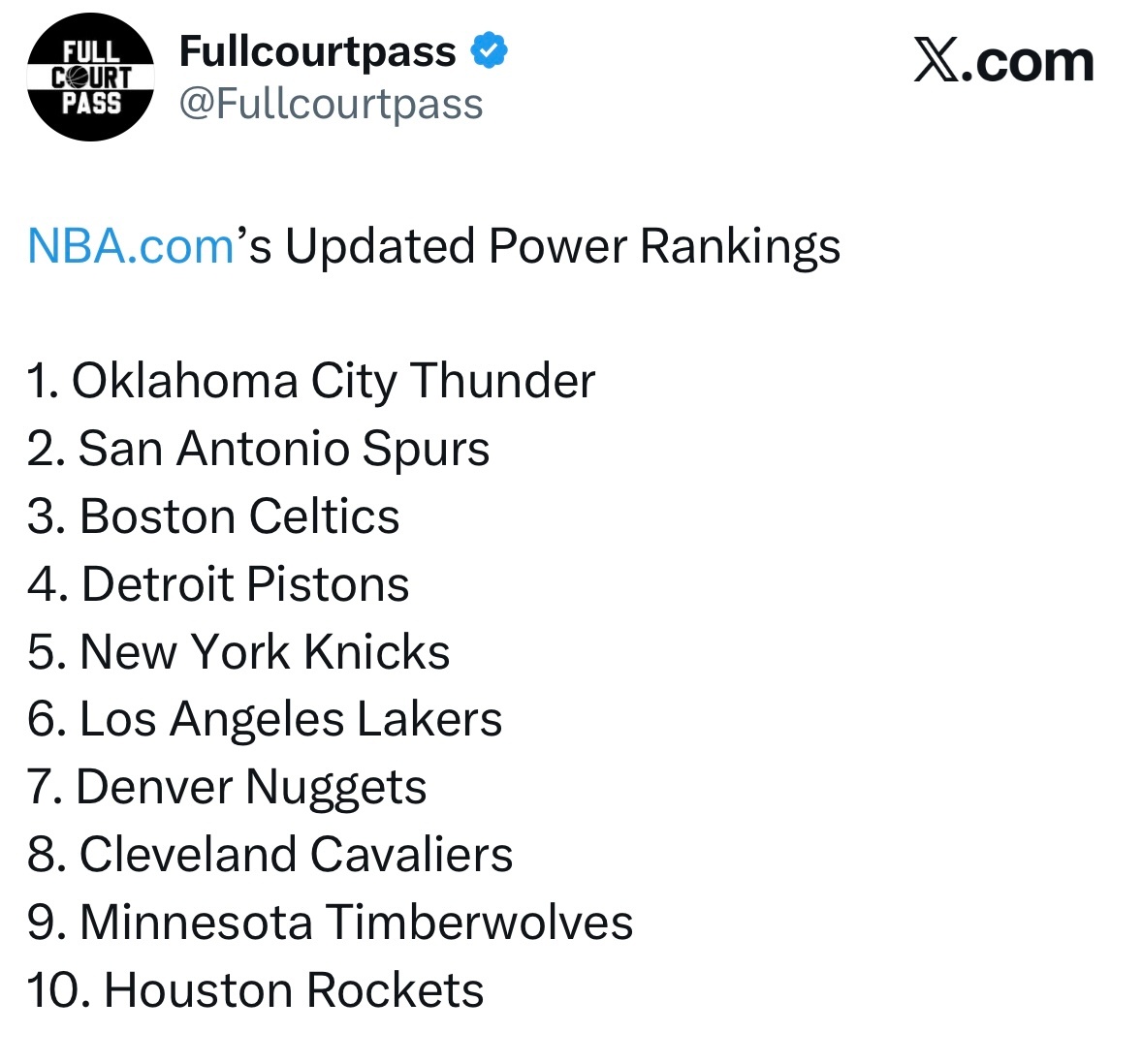 NBA官网最新实力榜:1. 俄克拉荷马城雷霆队2. 圣安东尼奥马刺队3. 波士顿凯尔特人队4. 底特律活塞队5. 纽约尼克斯队6. 洛杉矶湖人队7. 丹佛掘金队8. 克利夫兰骑士队9. 明尼苏达森林狼队10. 休斯顿火箭队