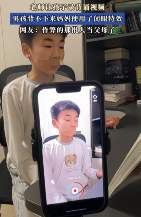 这到底在骗谁呢? 老师让孩子录背诵视频,男孩背不下来妈妈使用了闭眼特效,让男孩读课文。 妈妈可能是心疼孩子背不下来崩溃,也可能是怕交不了作业没面子,才用闭眼特效蒙混过关。可这根本不是帮孩子,是在教他最危险的东西。完不成任务可以靠作弊、靠投机取巧解决。 视频交上去看着完美,老师一时没看出来又怎么样?课堂抽查、考试、真正要用知识的时候,孩子还是什么都不会,到时候只会更崩溃、更自卑。 老师教孩子诚信,家长教孩子作弊;学校教孩子认真,家长教孩子糊弄。 孩子从小耳濡目染,会觉得走捷径比努力更管用,这种观念一旦扎根,比背不会《木兰辞》可怕得多。 糊弄得了作业,糊弄不了成绩;骗得过老师,骗不过人生。害人终害己!