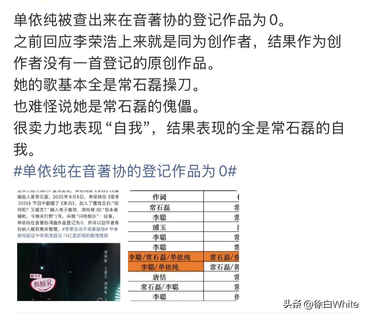 3月30日,单依纯在音著协的登记作品为0 昨天看单依纯标榜自己跟李荣浩一样是创作型歌手,今天网友查完发现创作0首歌…… 了解了一圈发现,单依纯背后有个人叫常石磊,单依纯所谓的原创歌曲,基本都是常石磊创作的,单依纯仅2首有涉及创作,感觉更像是挂名,这样的她,是怎么做到把自己跟独自创作出整首歌的李荣浩放在一起,说他们都是原唱歌手的……本就在海平面的路人缘感觉又要下降了……有一说一,单依纯唱歌确实有她的一套风格,好听是真的,职业素养有待提升也是真的!