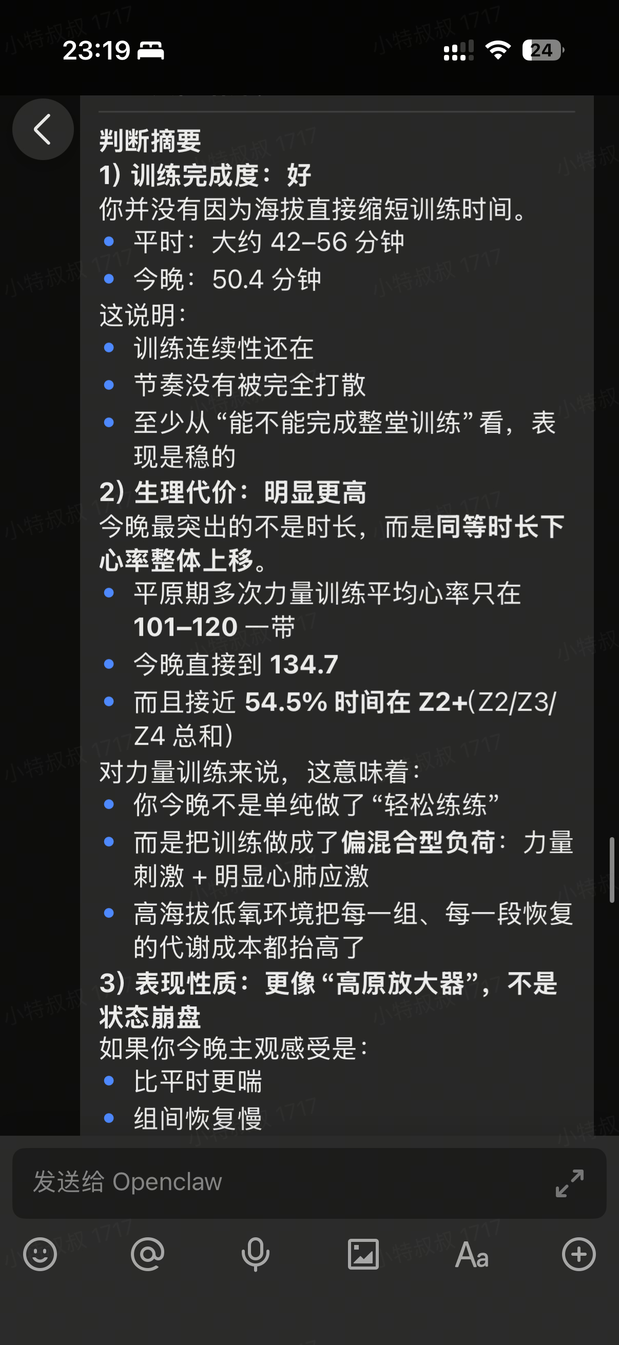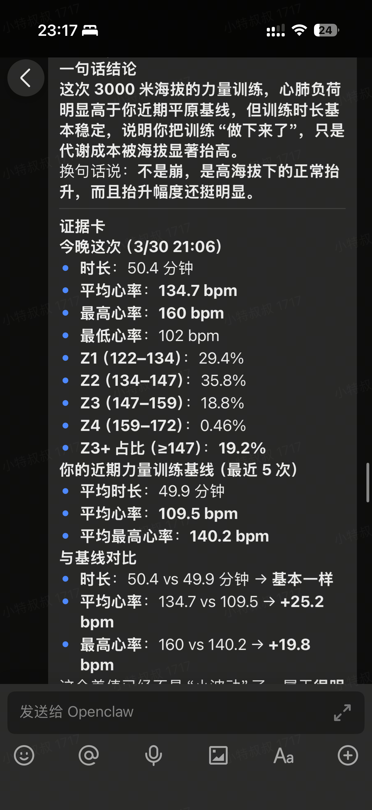 让OpenClaw看了下,今天海拔3000米的训练。心率 加了20+ ,稳稳地!