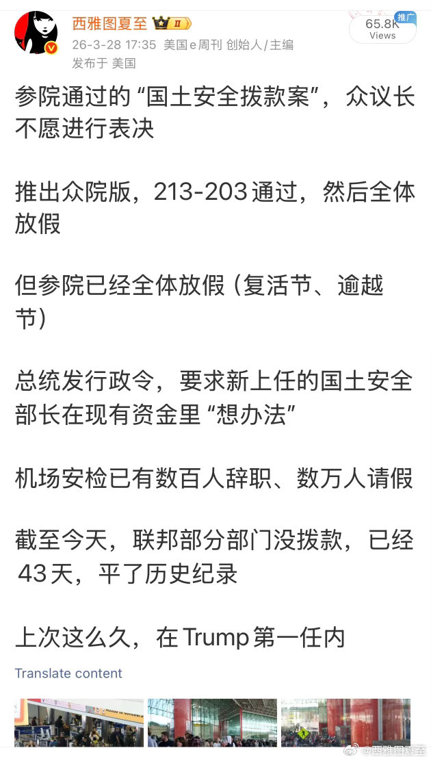 国土安全拨款案没通过,总统要求从现有资金里“想办法”周一,机场安检陆续收到工资,