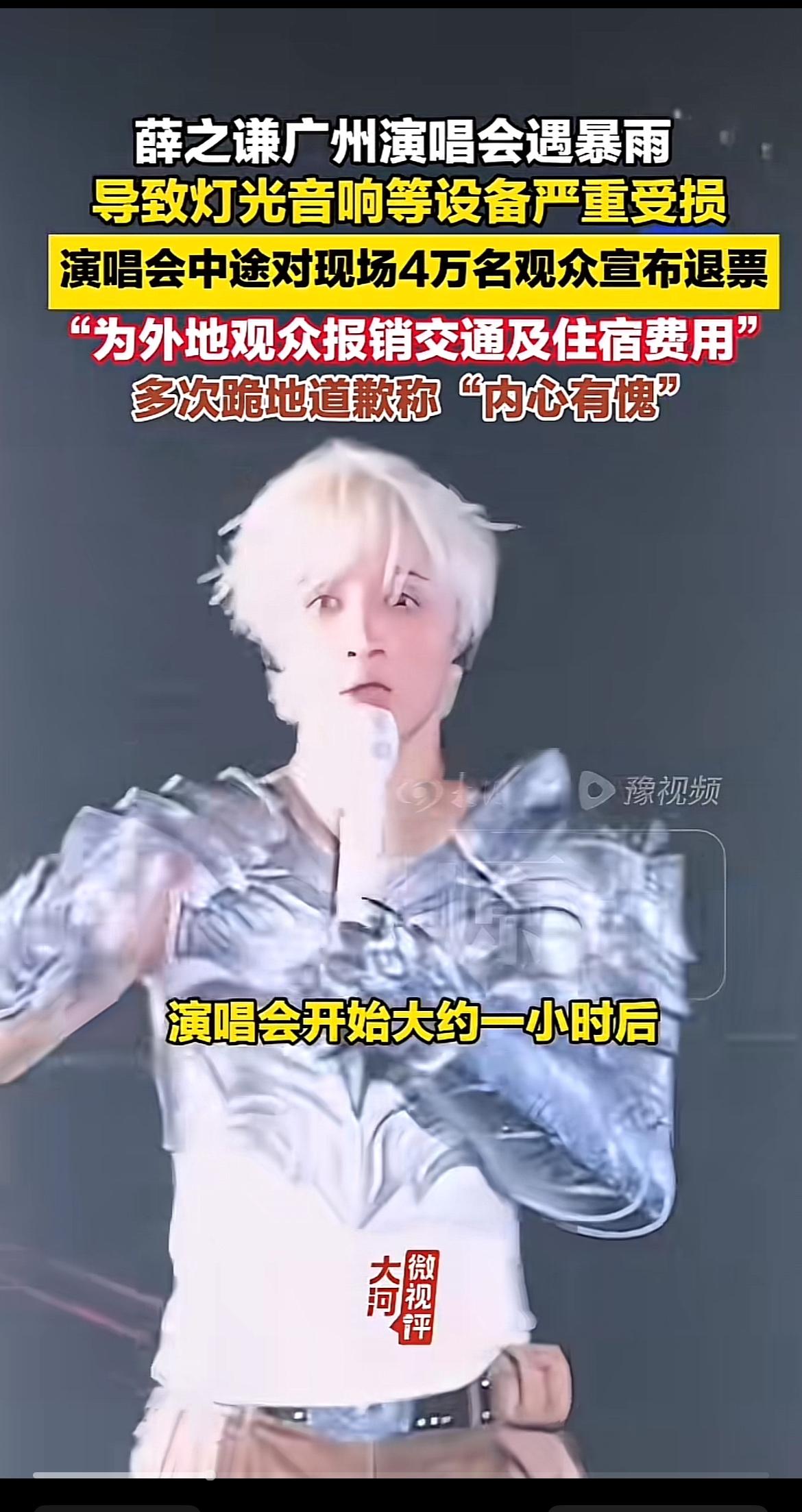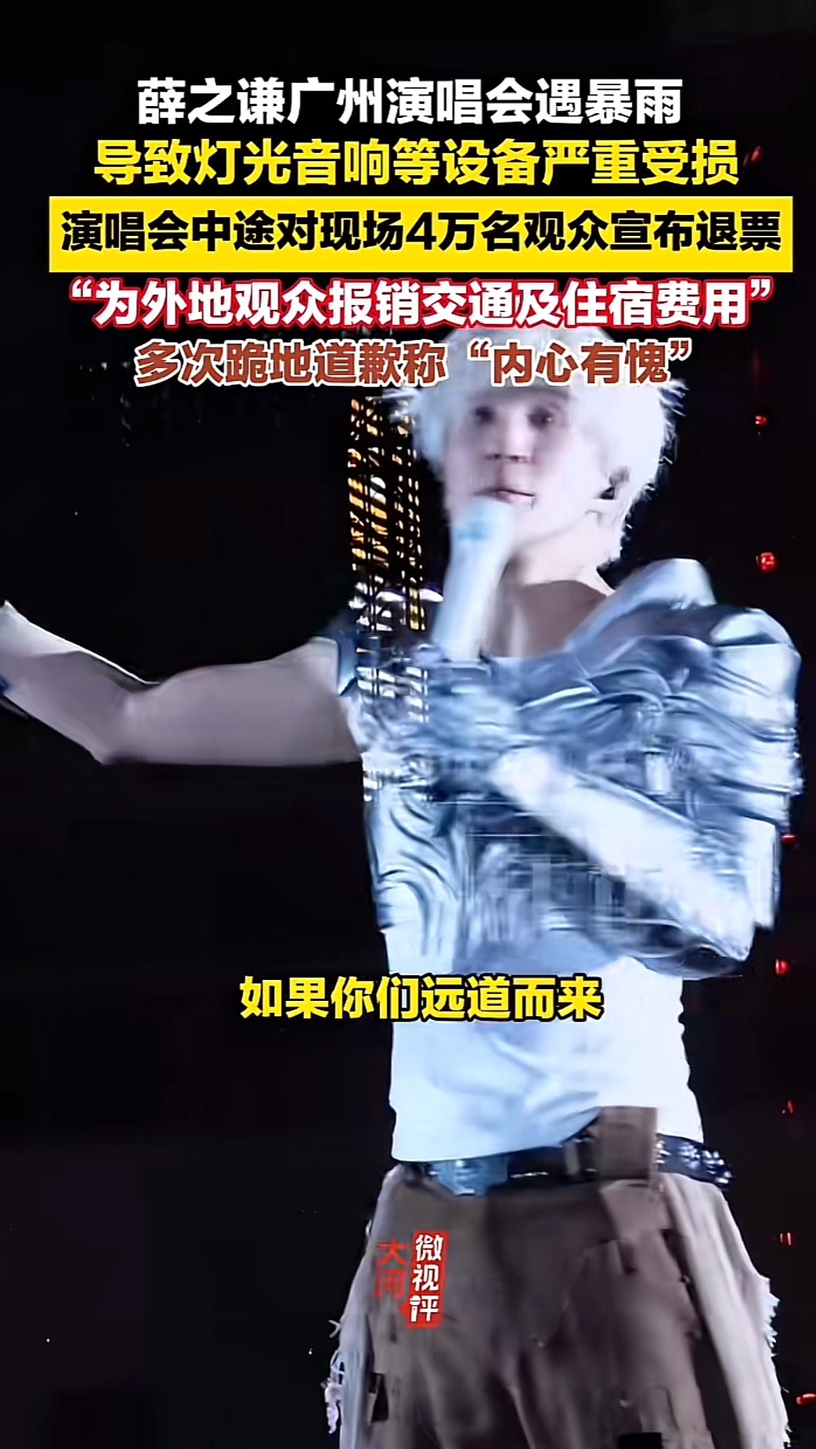 3月29日晚,薛之谦“万兽之王”巡演广州站可太糟心了。暴雨突袭,舞台灯光、音响设备大面积故障,演出效果大打折扣。这可是巡演首站的第6场啊,开场都延迟了。 唱到一半,薛之谦当场叫停,直接宣布无条件全额退票,已唱的半场免费送,外地观众交通、住宿费全报销,不想退票的还能换后续广东场次。他反复说“内心有愧”,还在湿滑舞台下跪致歉,声音都哽咽了。即便宣布退票,他也坚持把剩下的唱完。歌迷们也超给力,打开手机灯光形成星海,全场大合唱。这事儿一出全网刷屏,薛之谦这波操作真的是对舞台负责、对歌迷用心,值得点赞!