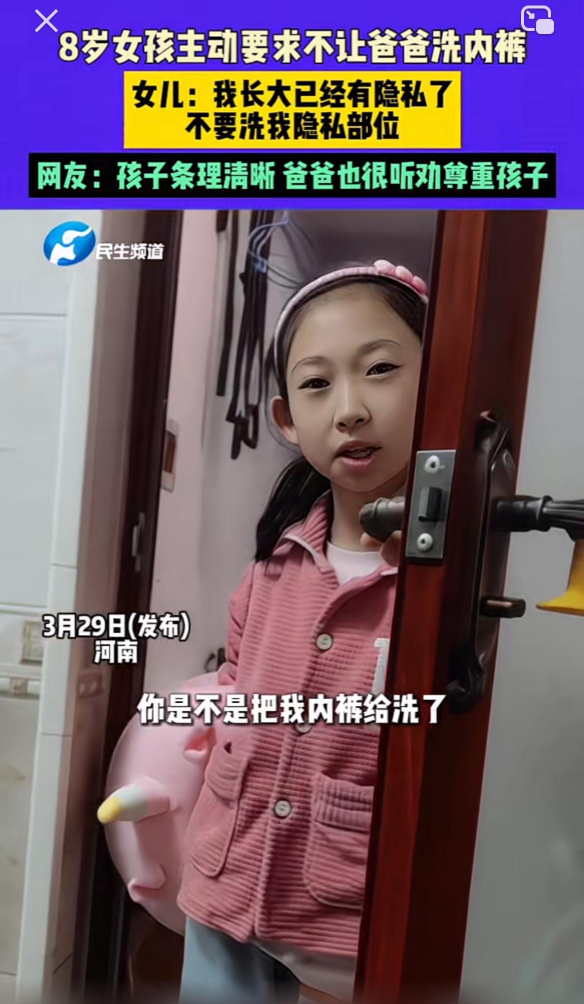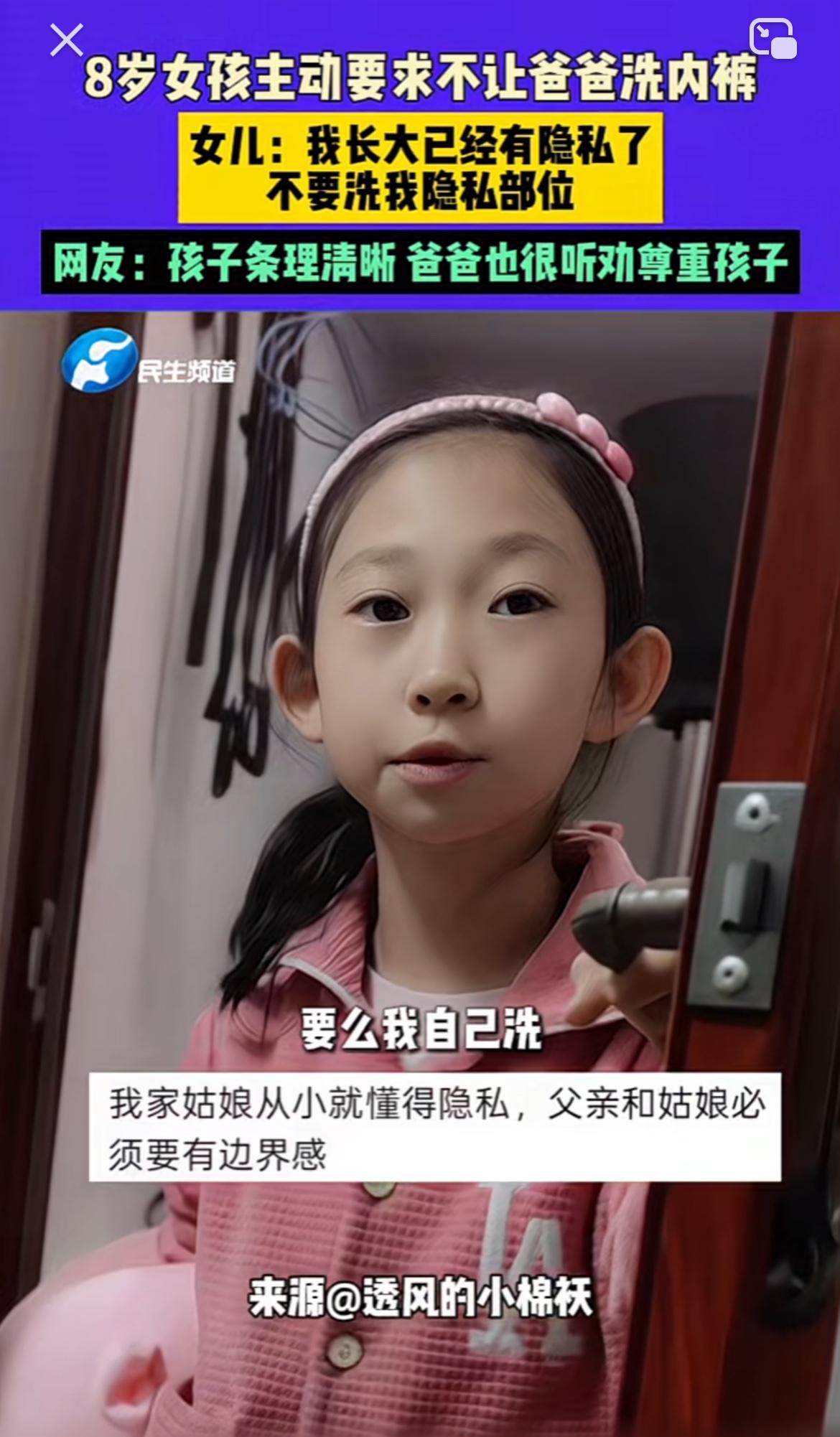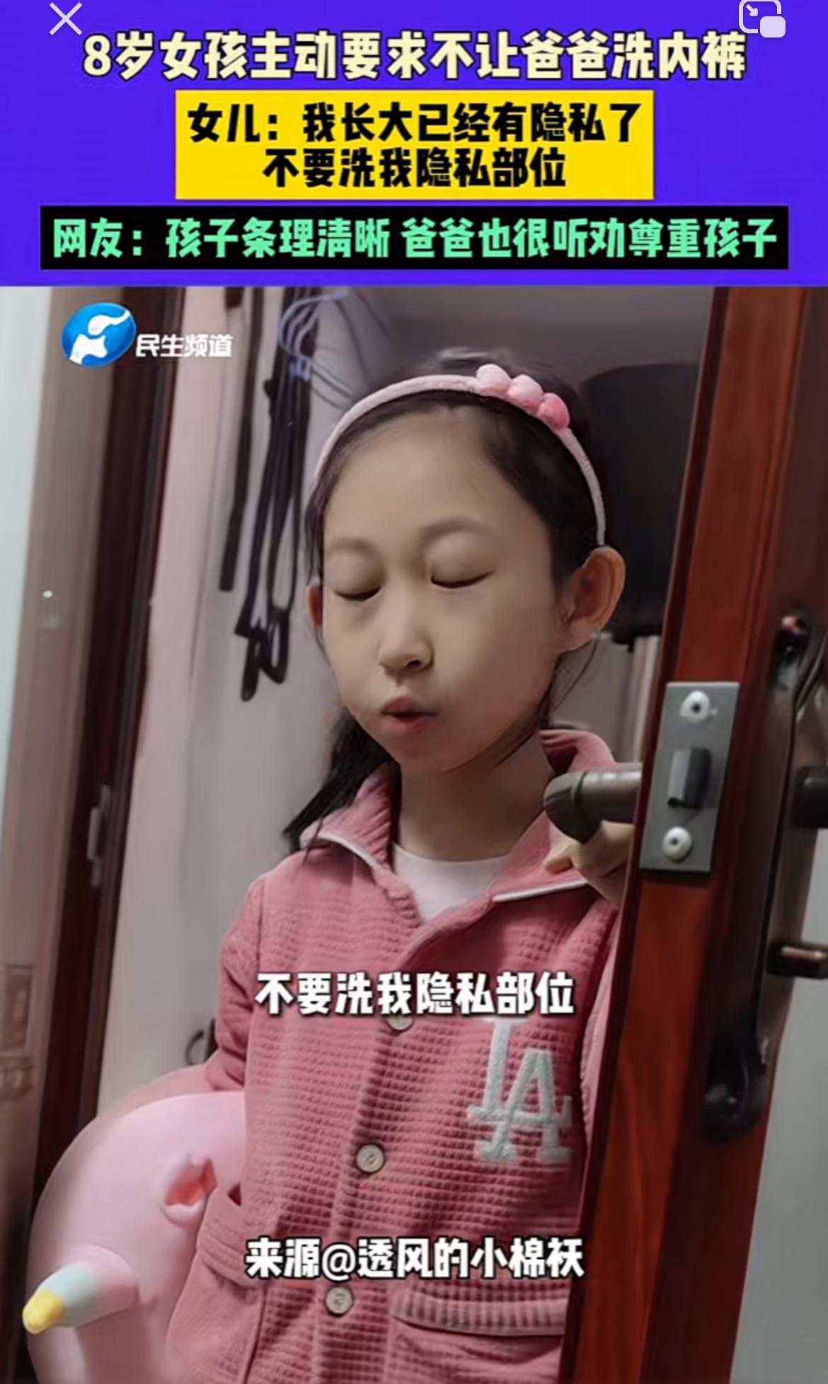 8岁女儿主动要求爸爸别洗内裤,这隐私意识萌芽得太赞了!其实孩子一般两三岁开始有性别概念,五岁时性别意识就增强不少。这女孩到8岁有这反应很正常,说明她开始懂得维护自己的“边界感”了。 想想小时候,有些孩子到七八岁还由父母洗隐私部位。站在父母角度,那是出于爱和保护,但从孩子成长看,孩子大了就该有自己的隐私空间。这女孩主动提出来,是成长的体现。家长也该顺势培养孩子的独立意识和自我保护意识,让孩子健康成长。
