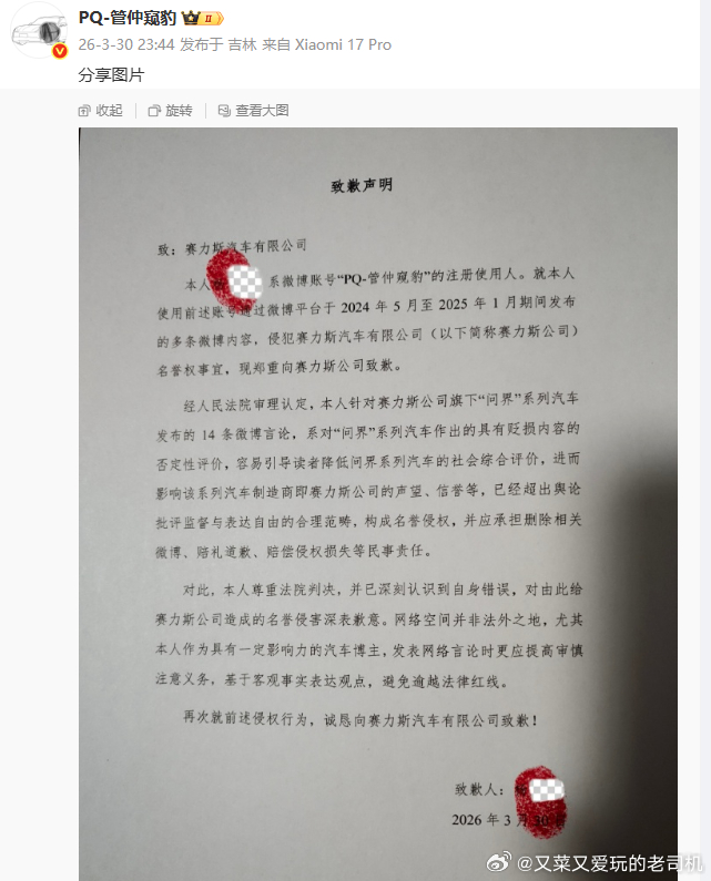 PQ-管仲窥豹对赛力斯的公开道歉信侵犯赛力斯公司名誉权的行为,发生于2024年5