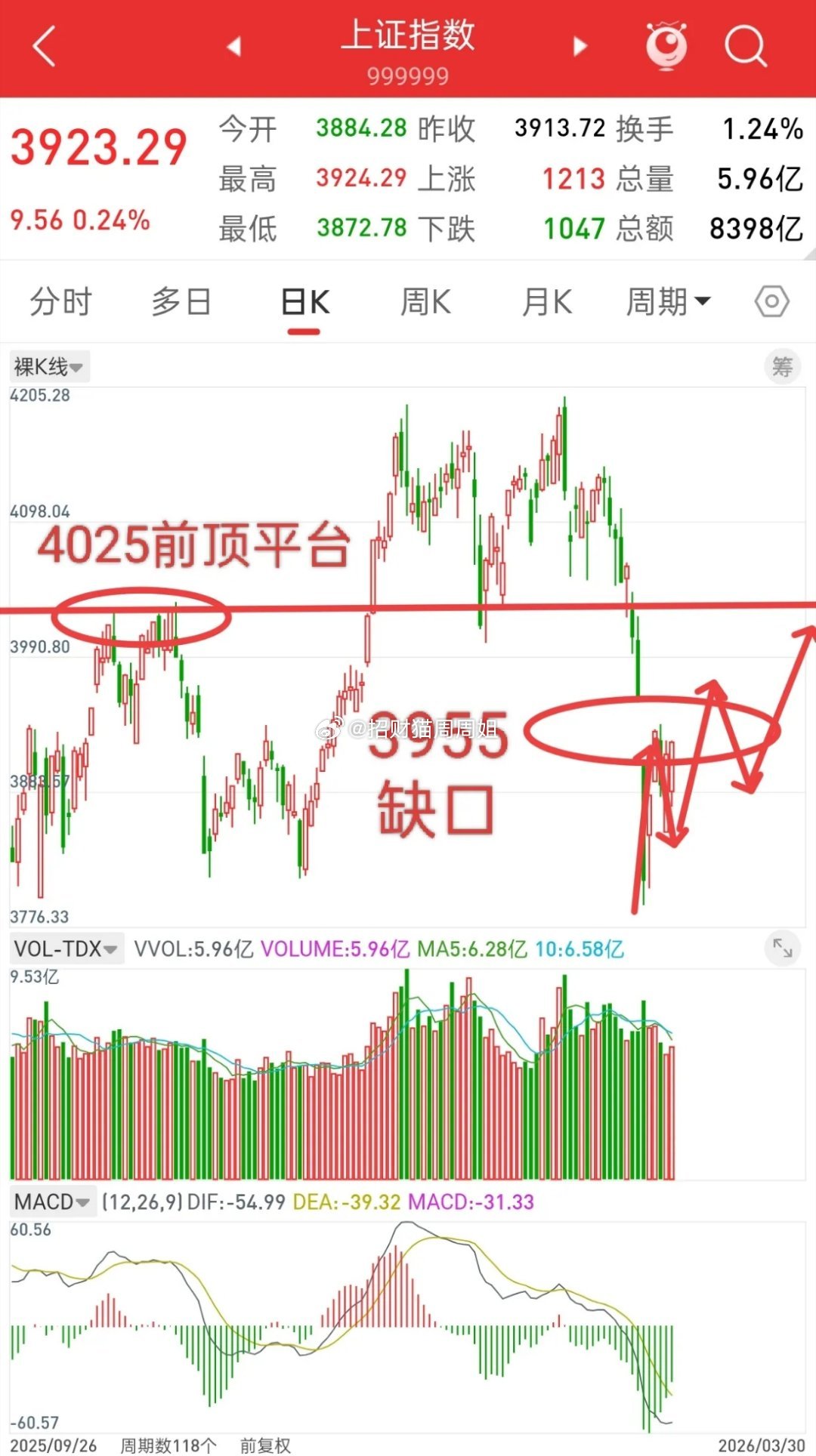 因此,观点不变,接下来第一目标先看缺口3955,第二目标再看前顶4025。