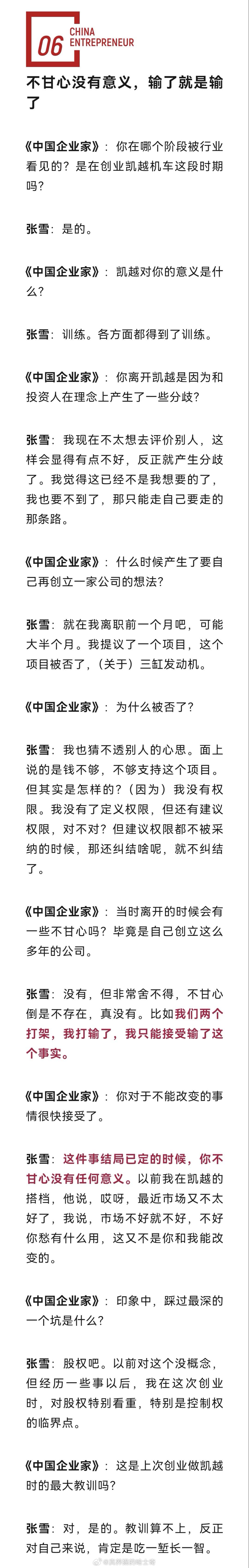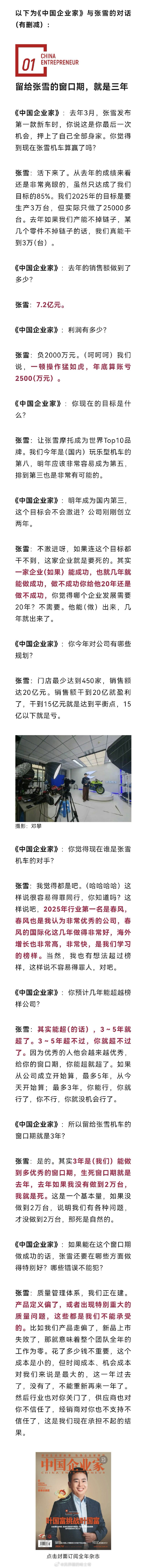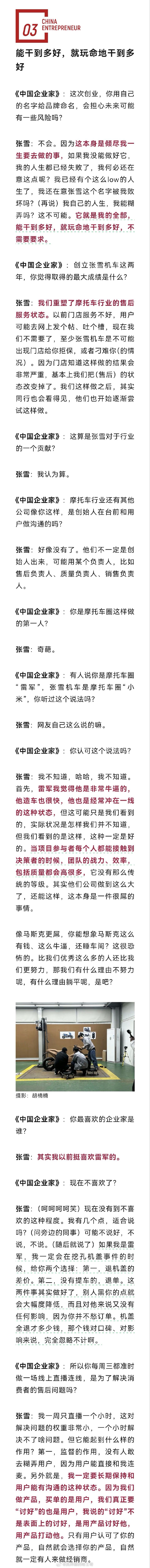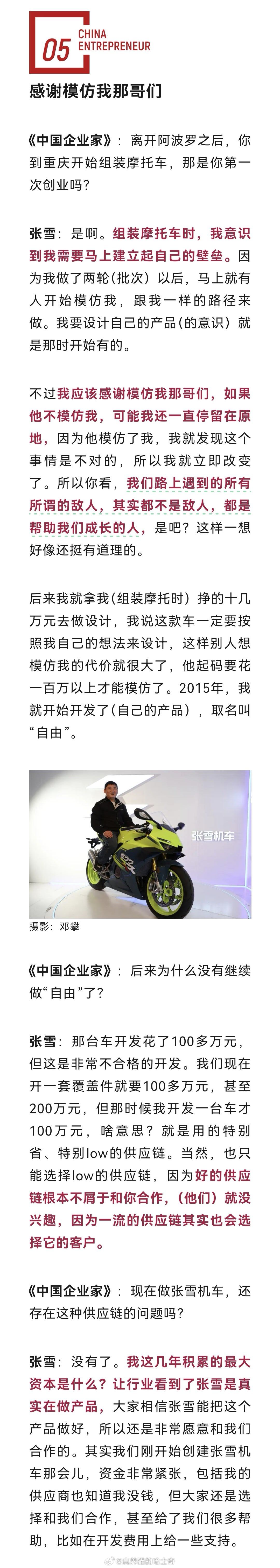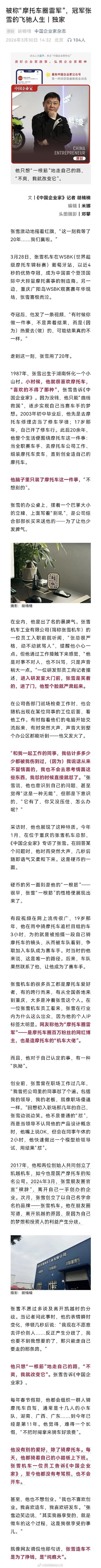 大家可以看看企业家杂志对张雪的专访《被称“摩托车圈雷军”,冠军张雪的飞驰人生|独家》