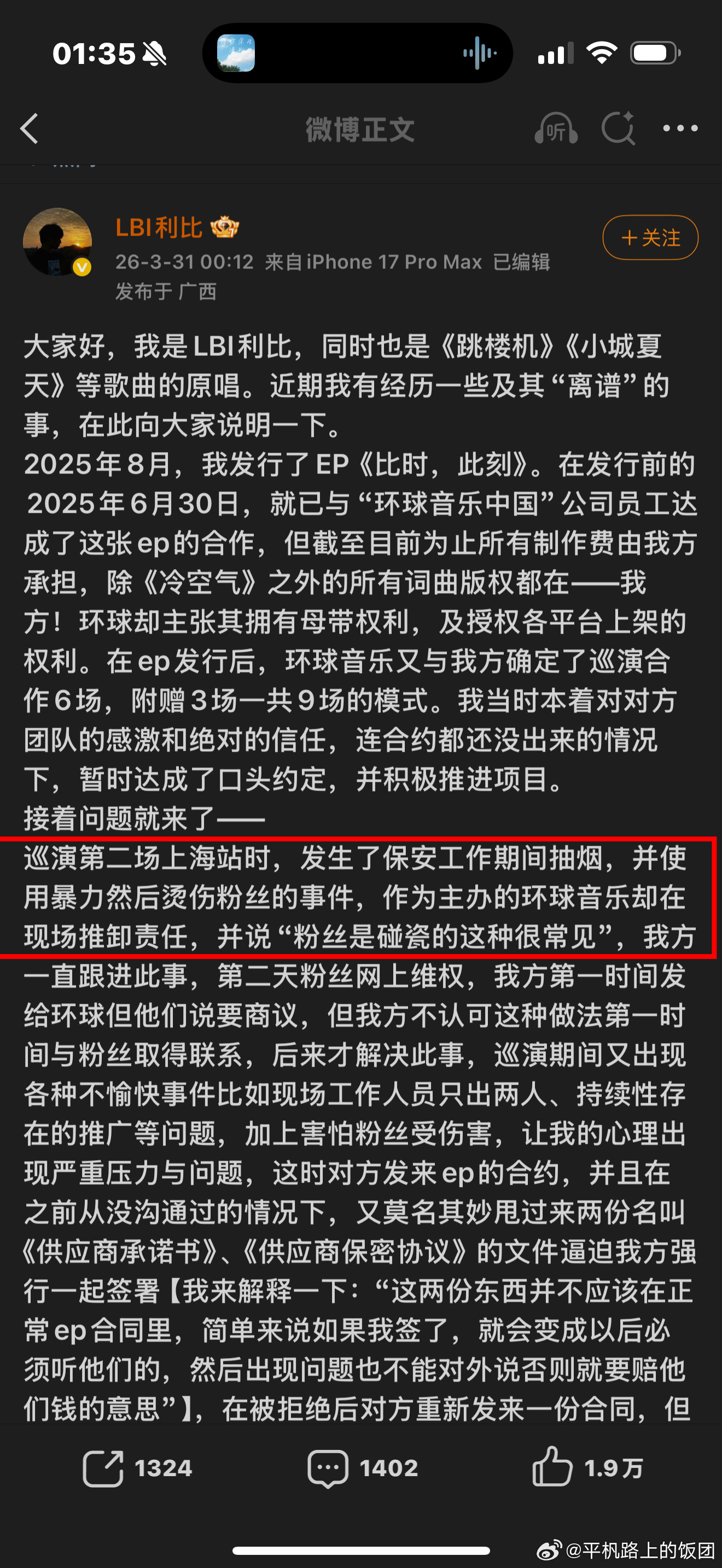 跳楼机原唱实在是忍不下去了,发长文控诉环球音乐,称环球音乐一直对外宣称造谣说自己是环球音乐的签约艺人,并且在发行《此时此刻》这张专辑时和环球音乐达成合作巡演,结果环球音乐纵容自己场地的保安拿烟头烫伤粉丝还声称“粉丝碰瓷”