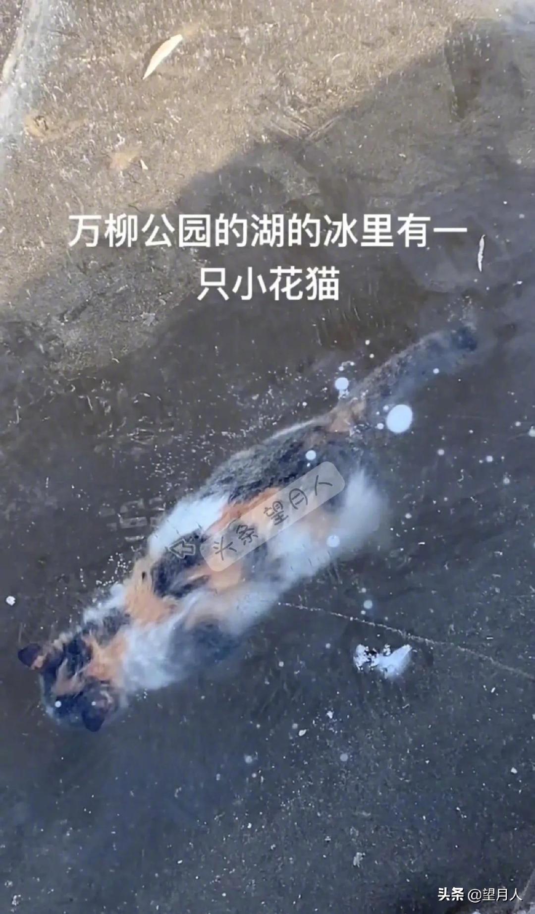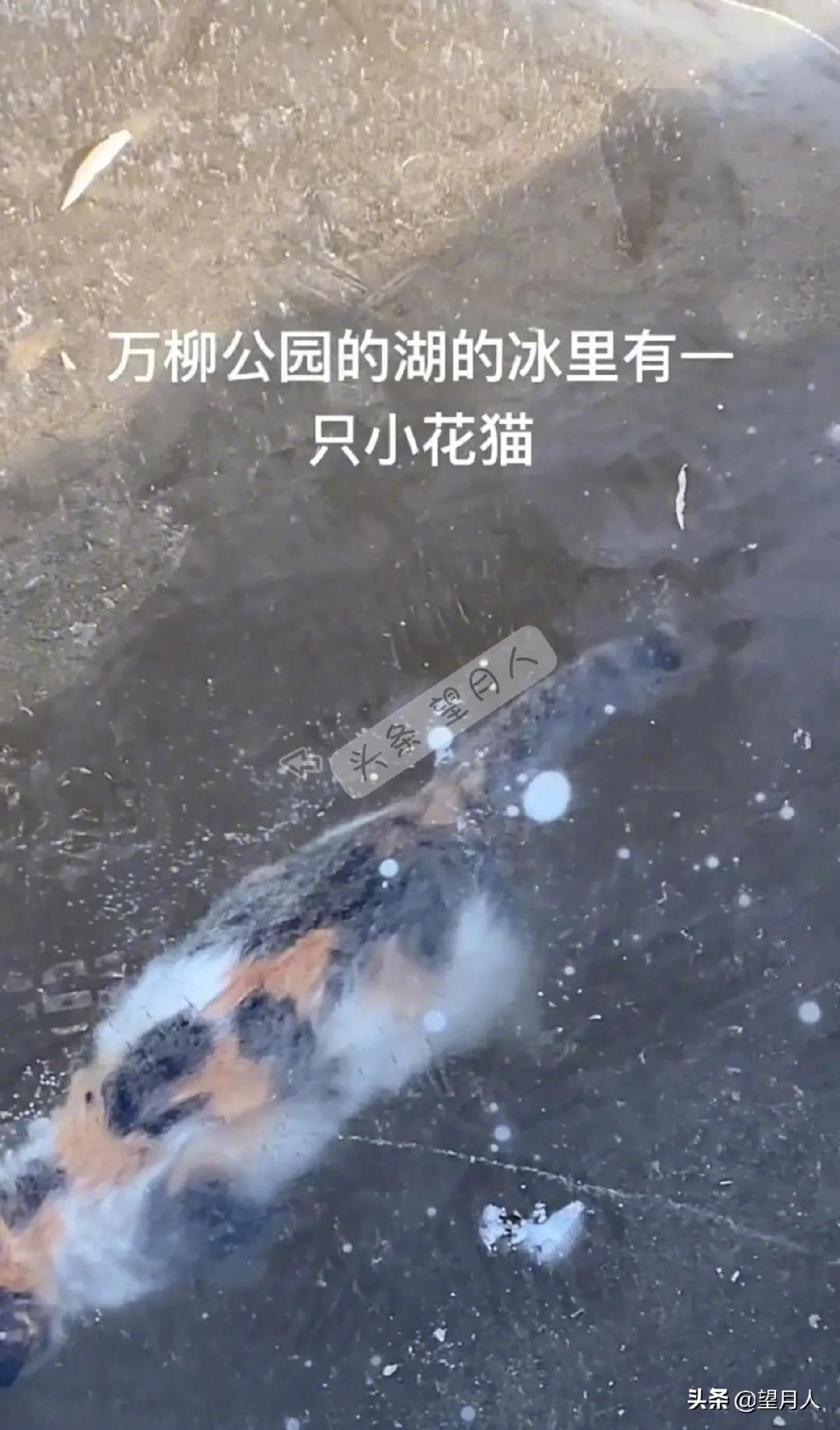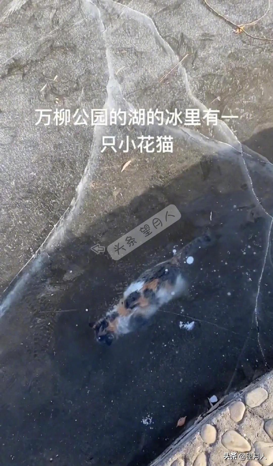 今天,有河北张家口的网友爆料,她在公园湖水的冰下面发现了一只小花猫。