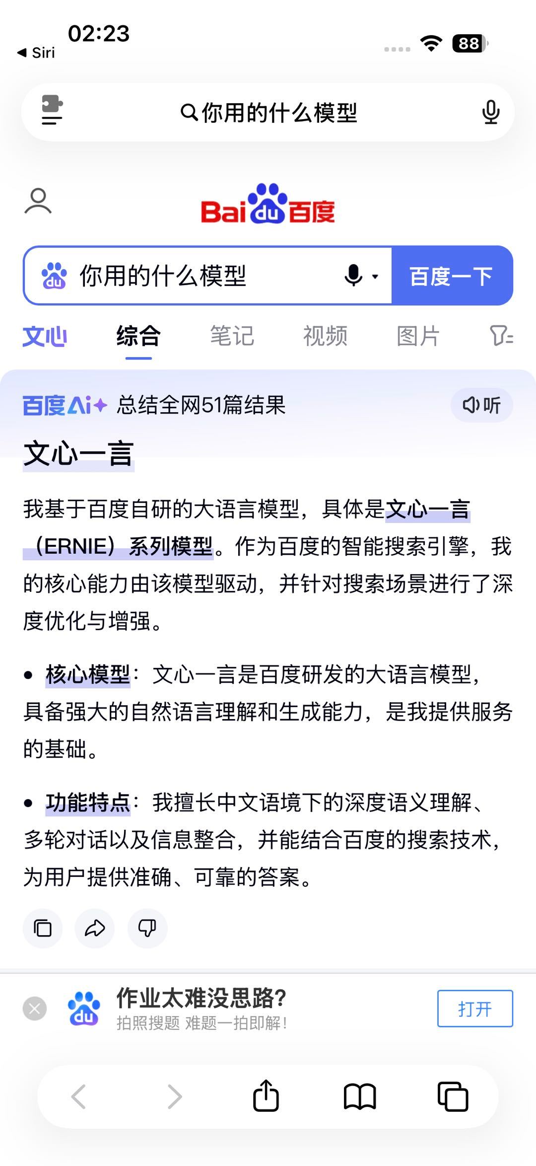【勘误】这个图是不正确的,无论你拿国行还是美版 iPhone,只要默认搜索引擎是百度都会返回这个结果,这并不能说明国行版 Apple Intelligence 采用百度文心一言大模型。