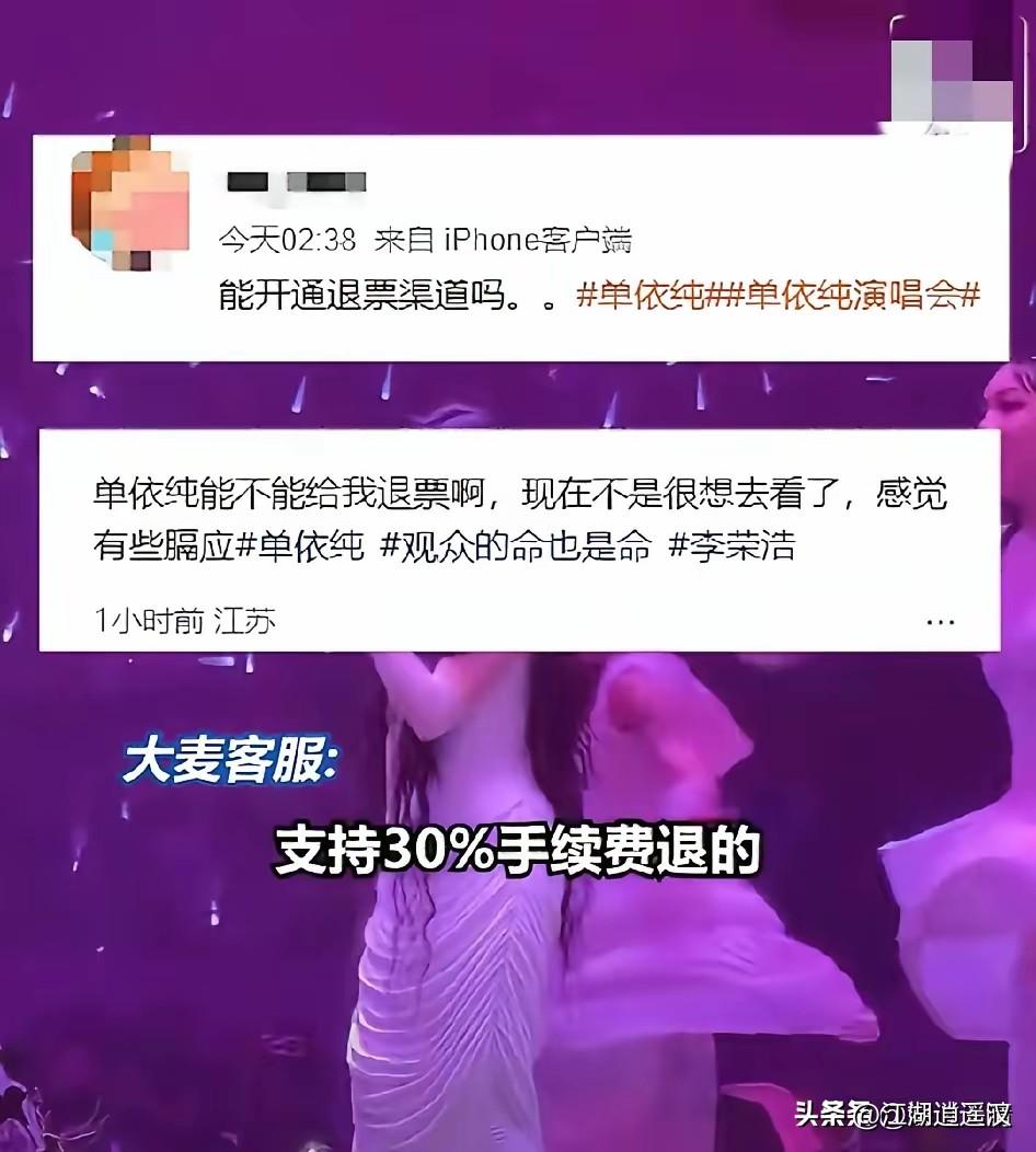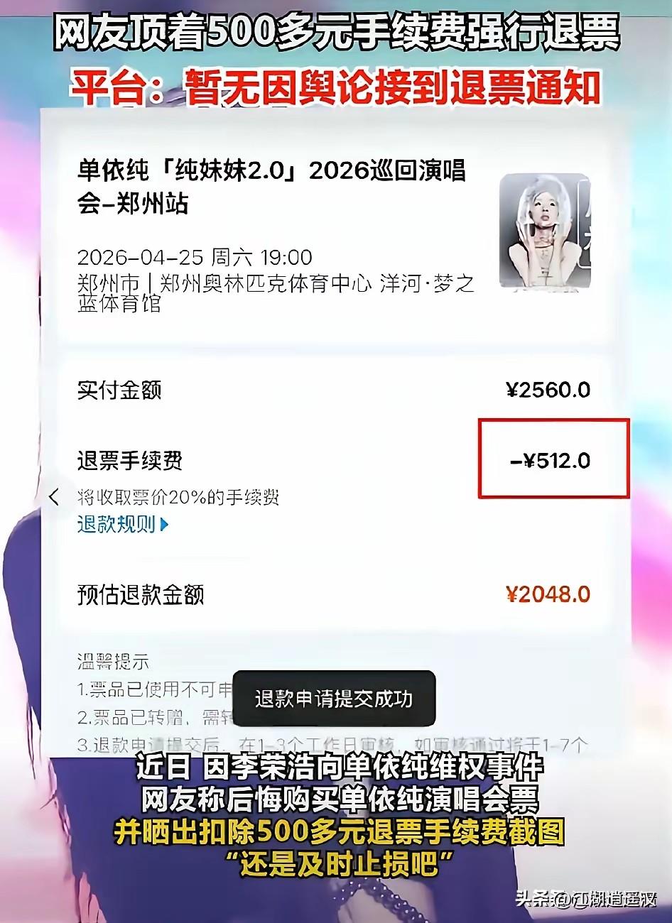 这事其实挺冤的。退票扣高额手续费,本质是票务平台的规则问题,跟歌手本人关系不大,把矛头全对准单依纯确实有点不讲理。李荣浩事件刚过,大众情绪本就敏感,一有类似退票争议就容易被放大,连带艺人一起被骂。 但理智来看,艺人并没有取消演唱会,也没承诺兜底退票,按平台规则扣费本就是行业常态,只是这次刚好被推到风口浪尖。网友情绪可以理解,但把平台的锅全甩给歌手,确实有点不公平。 单依纯