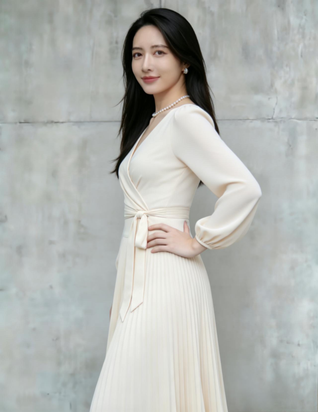 浅杏色V领围裹式长袖连衣裙, 灯笼袖设计温柔大气,腰侧系带收腰。 百褶大摆长裙,垂坠感十足, 搭配珍珠项链,优雅贵气的名媛气质。