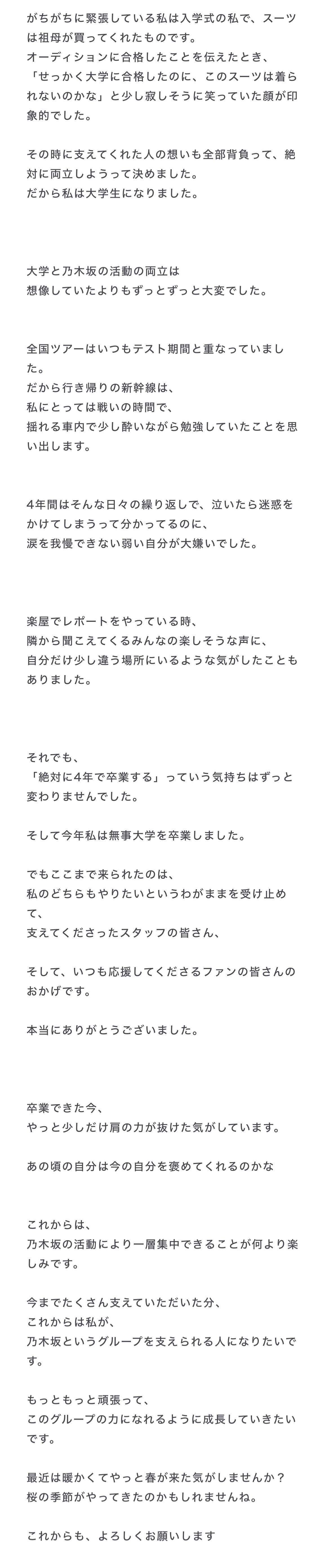 川﨑桜「卒業式では少し大人になった自分を表現したくて、いつもは選ばない紺色の振袖を選んでみました。でも振袖と袴はしっかり桜柄です。笑 普段自分は頑張ったって言いたくないと思っているのですが、今日だけはちょっとだけ、頑張ったことを書かせてください。」