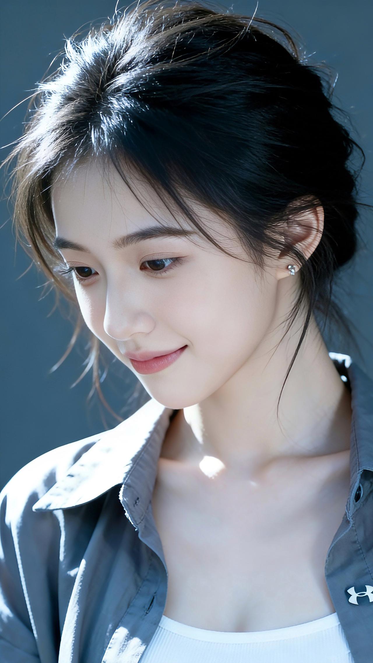 九帧同绘侧颜温婉仙!乌发束挽散碎发,灰衬衫敞领衬雪肌。眉眼低垂含笑,唇角浅扬似春