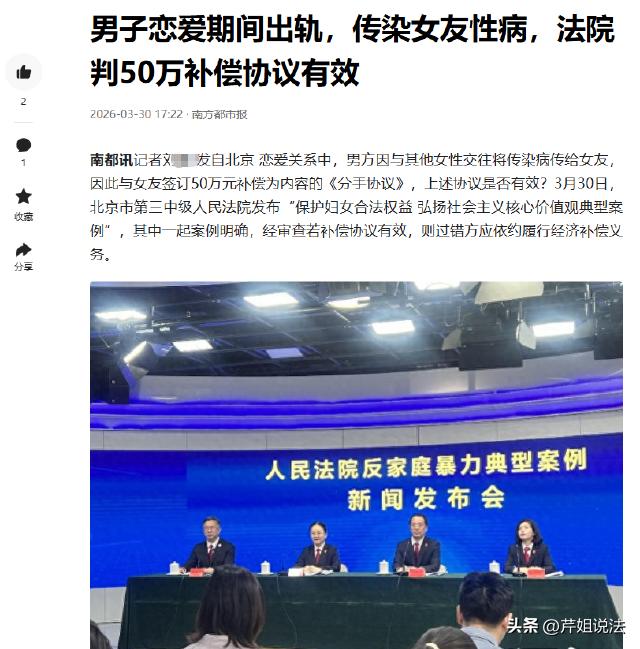 北京,一男子在和女子恋爱时,还跟其他异性发生了夫妻之实的关系,把疾病传染给了女子,致其身体受伤。两人分手后,男子承诺补偿女子50万,分10年每年给5万。可到付款时间,男子一分没给,女子将他告上法庭,要求一次性付50万及利息。男子却称分手协议是女子胁迫所写,对方索要的是分手费和精神损失费,违背公序良俗不用给,但法院却有不同的看法。 2023年春天,张某和李某已经同居两年,在外人眼里是感情稳定的小情侣。 张某那段时间总觉得下身瘙痒,她以为是普通妇科病,自己去药店买了洗液和栓剂,可用了半个月一点没好转。 她硬着头皮去了医院,检查结果是她感染了尖锐湿疣,一种主要通过性接触传播的性病。 张某拿着报告单,手抖得差点拿不稳,她脑子里第一个念头就是:我明明只有李某一个男人! 当天晚上,张某拿着报告单质问李某。 李某一开始还支支吾吾,被问急了才承认:恋爱期间他同时和另一个女人交往,还发生了关系,那个女人有性病,他也被传染了,又传给了张某。 张某当场就炸了,她想起自己这两年的真心付出,想起李某平时的甜言蜜语,现在全成了笑话。 她哭着收拾东西要搬走,李某跪在地上求她原谅,说自己知道错了,愿意补偿她。 第二天,李某主动写了一份《分手协议》,上面写着:因本人过错导致张某感染性病,自愿补偿张某50万元,分10年支付,每年5万元,于每年1月1日前支付。 李某签了字,还按了手印。 张某虽然心里恨,但想着李某至少愿意负责,就收下了协议。 可到了2024年1月1日,李某连个电话都没打,更别说给钱了。 张某催了几次,李某直接拉黑了她。 张某直接把李某告上了法庭,要求他一次性支付50万补偿款,还有逾期利息。 法庭上,李某换了副面孔,他一口咬定协议是张某胁迫他签的,那天张某拿着菜刀说要 自 杀,他害怕才签的。 他还说,这50万是分手费和青春损失费,法律不支持这种费用,违背公序良俗,他不用给。 张某当庭反驳:我什么时候拿菜刀了?你写协议的时候,我手机里还有你道歉的语音呢!这50万是你自愿给的,是我身体受伤的补偿,不是分手费! 法院调取了张某提供的证据,包括李某道歉的语音、医院的诊断证明、分手协议的原件。 当时,还问了双方的朋友,都说张某性格温和,不可能拿菜刀胁迫人。 李某说协议是胁迫签的,法律上怎么认定? 民法典第一百五十条规定,一方或者第三人以胁迫手段,使对方在违背真实意思的情况下实施的民事法律行为,受胁迫方有权请求人民法院或者仲裁机构予以撤销。 张某提供了李某道歉的语音,且朋友证明张某性格温和,李某无法证明胁迫事实,所以协议有效。 李某说50万是分手费和青春损失费,违背公序良俗,法律上怎么认定? 民法典第八条规定,民事主体从事民事活动,不得违反法律,不得违背公序良俗。 50万是李某因过错导致张某身体受伤的补偿,属于侵权损害赔偿,和分手费、青春损失费性质不同,不违背公序良俗,李某必须支付。 最终法院判决:分手协议是双方自愿签订,合法有效,李某应一次性支付张某50万元补偿款,并按照银行间同业拆借中心公布的贷款市场报价利率支付逾期利息。 李某自己做错事还耍赖,就该受到惩罚! 恋爱可以真心,但别被甜言蜜语冲昏头。 要是遇到对方过错导致自己受伤,一定要保留证据,该维权时别手软。 法律不会偏袒耍赖的人,只会保护真正受伤的人! 你觉得遇到这种事,是该选择原谅还是坚决维权?