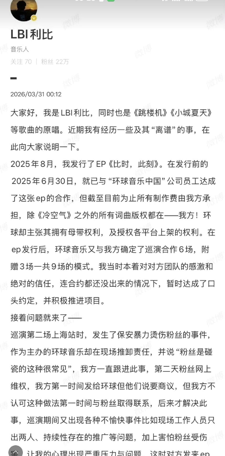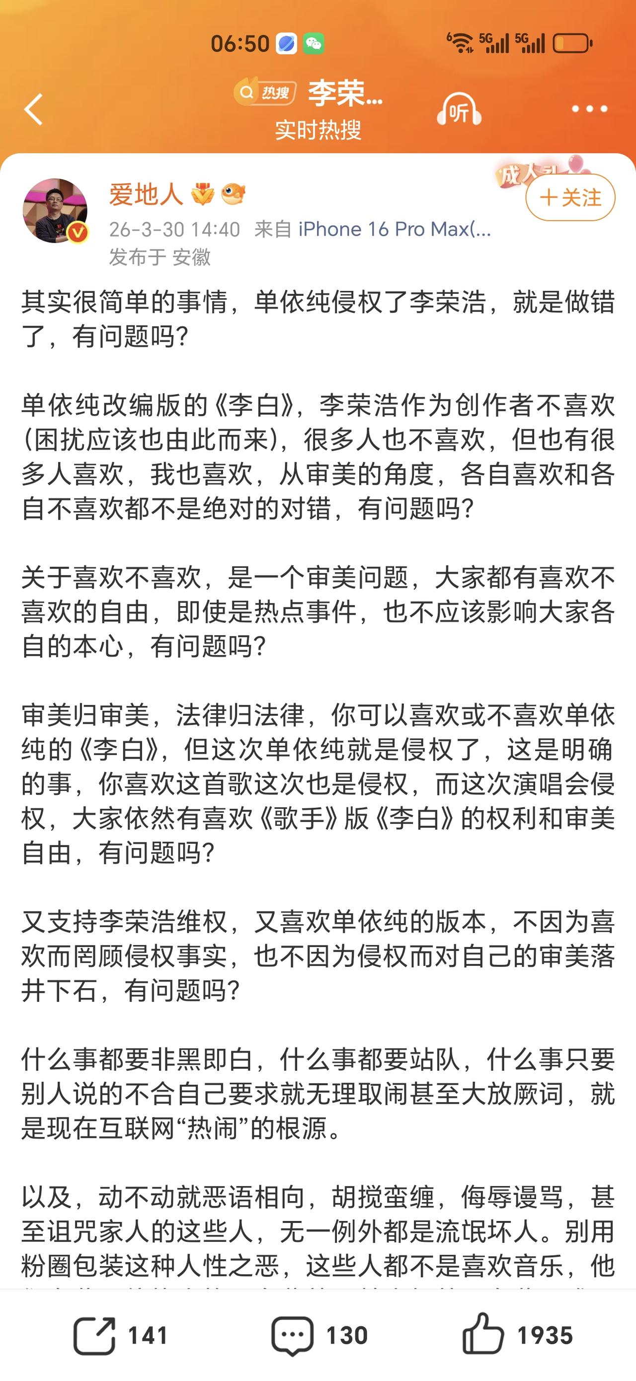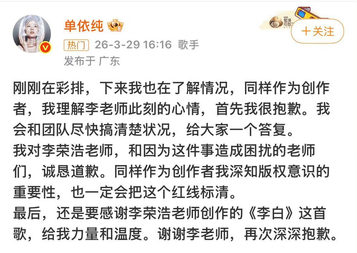 单依纯演唱会侵权事件引发了蝴蝶效应,真是越来越热闹了! 先是李荣浩控诉单依纯强行侵权演唱《李白》, 然后是吴向飞喊话李荣浩也唱过自己的歌没有授权, 再接着蹦出了庞麦郎喊话华晨宇未经授权演唱《我的滑板鞋》, 现在又来了LBI指控环球音乐中国侵权《跳楼机》, 除了这些,还有好多艺人发声,这一场维权大战悄然兴起,估计很多歌手们都开始默默排查自己的演唱会曲目了吧,到底都有授权吗[捂脸]! 好多知名乐评人都开始发声,在先是一边倒的支持维权之后,开始为单依纯说好话的也有,现在这个情形,李荣浩的形象突然高大威猛了,原来平时笑眯眯的老好人这么刚[赞]! 言辞犀利思路清晰,当真是所有想维权的歌手的典范,都像李荣浩一样操作,保管都长记性,下次再也不敢了! 单依纯的态度还不错,道歉之后又开启了未开场演唱会的免费退票,这几天的事情闹得确实有观众不想去看演唱会了,对她还是有一定影响的,塌下去的人设要慢慢修复,好在年轻,有改的机会! 但是事情的本质可能并不在侵权本身,是她的作品风格和她的音乐态度,太多人接受不了甚至是讨厌,这个就要好好考虑一下了,今后的路要怎么走才长远!
