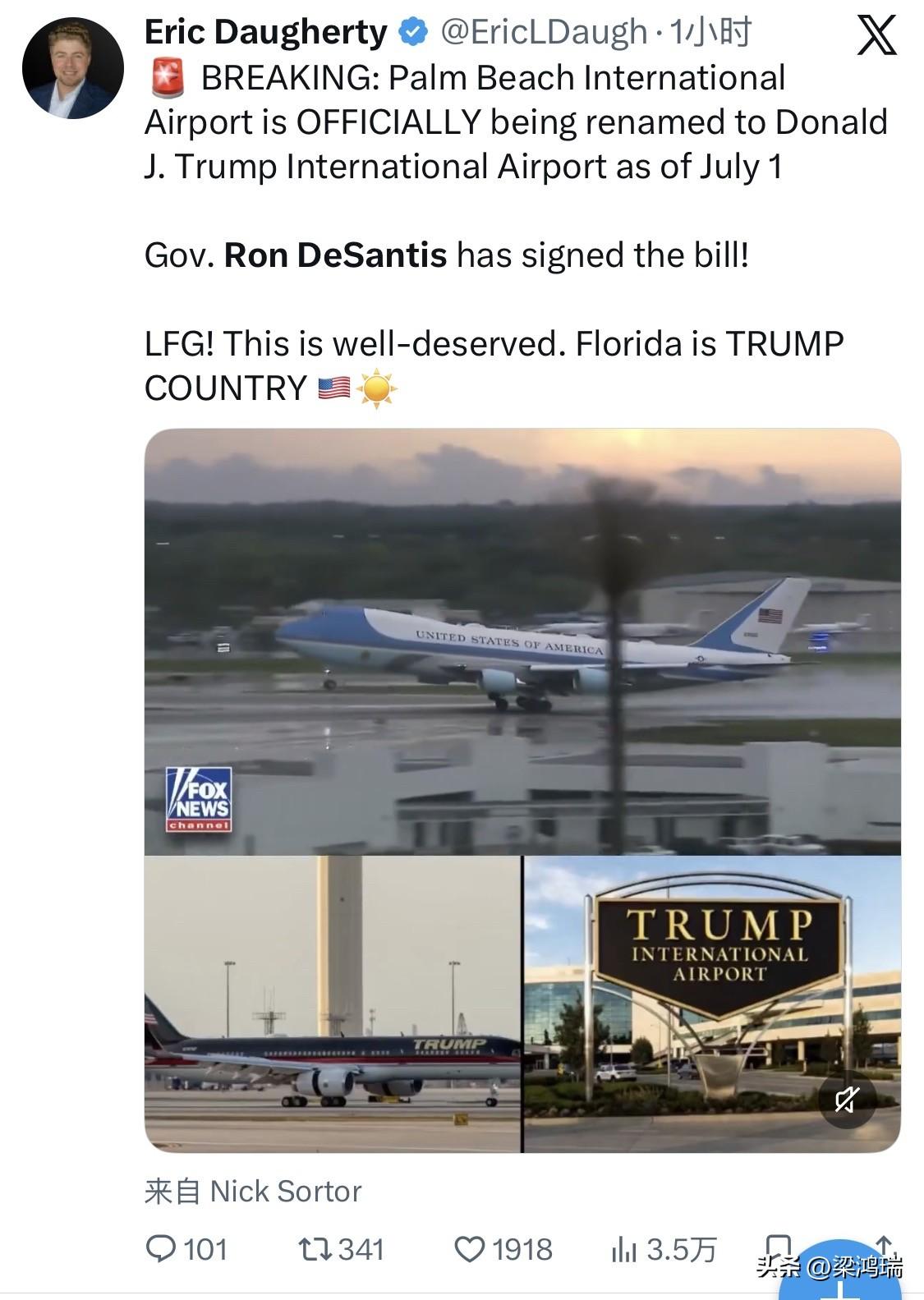 根据 2026 年 2 月的消息,佛罗里达州议会已经批准了将棕榈滩国际机场 (PBI) 更名为“唐纳德·J·特朗普总统国际机场” (President Donald J. Trump International Airport) 的法案。 佛罗里达州众议院于 2026 年 2 月 17 日以 81 票赞成、30 票反对通过该法案。随后,州参议院于 2 月 19 日以 25 票赞成、11 票反对的结果予以批准。该法案在州议会通过后,被送交至共和党籍州长罗恩·德桑蒂斯 (Ron DeSantis) 等待签署以正式生效。 最新官方消息:棕榈滩国际机场将更名为唐纳德·J·特朗普国际机场,此前罗恩·德桑蒂斯签署了HB919法案,该变更将于7月1日生效。 该机场位于西棕榈滩,距离特朗普的海湖庄园 (Mar-a-Lago) 仅几英里,是他频繁使用的交通枢纽。此举在当地引发了分歧,支持者认为是对这位前总统/现任总统的致敬,而民主党人和部分当地民众则对此表示反对,认为该决定无视了当地的声音。