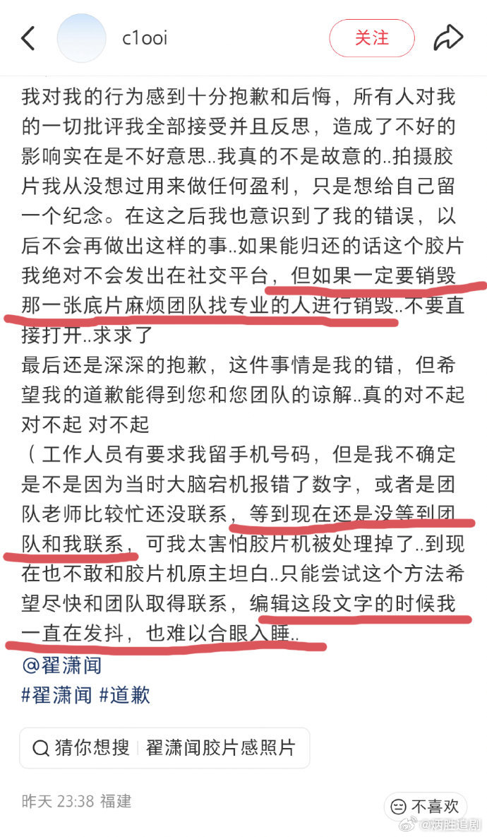 网友发帖道歉,恳求对方归还胶片机。起因是博主在没有取得翟潇闻同意的情况下拍摄了一张胶片,工作人员说胶片机必须整个上缴,可以再给一个新的。但胶片机是找朋友借的,里面有非常重要的亲人的照片,朋友有严重的精神疾病,害怕朋友知道胶片机被没收销毁或者胶片损坏后做出过激行为。博主承担不了朋友失控的后果,再三恳求翟潇闻团队归还原来的胶片机。