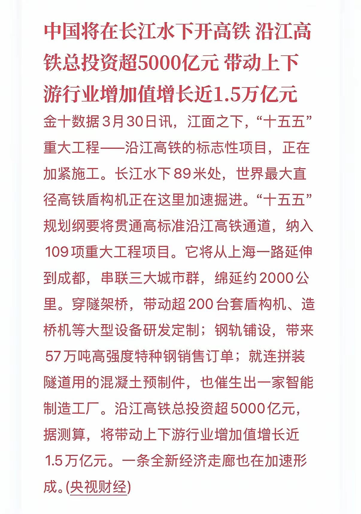 羡慕啊!不说老外羡慕,东北人也羡慕这样庞大工程! “89米深、14公里隧道、沿江高铁(沪渝蓉通道)全长约2000公里”这太震撼了,什么时候辽宁沿浑河修建一条就好了,直接抚顺~沈阳~台安~盘锦是不是也很好; 当然沈阳~大连~烟台~青岛的沈青高铁启动也是很好的; 如果沈阳~丹东~平壤~首尔高铁搞起来也是很好的! 反正未来越来越好,祝福长江沿线高铁,甚至未来黄河沿线高铁,直接把中国拉进了距离,出行会越来越方便,感受满满的强大的中国!