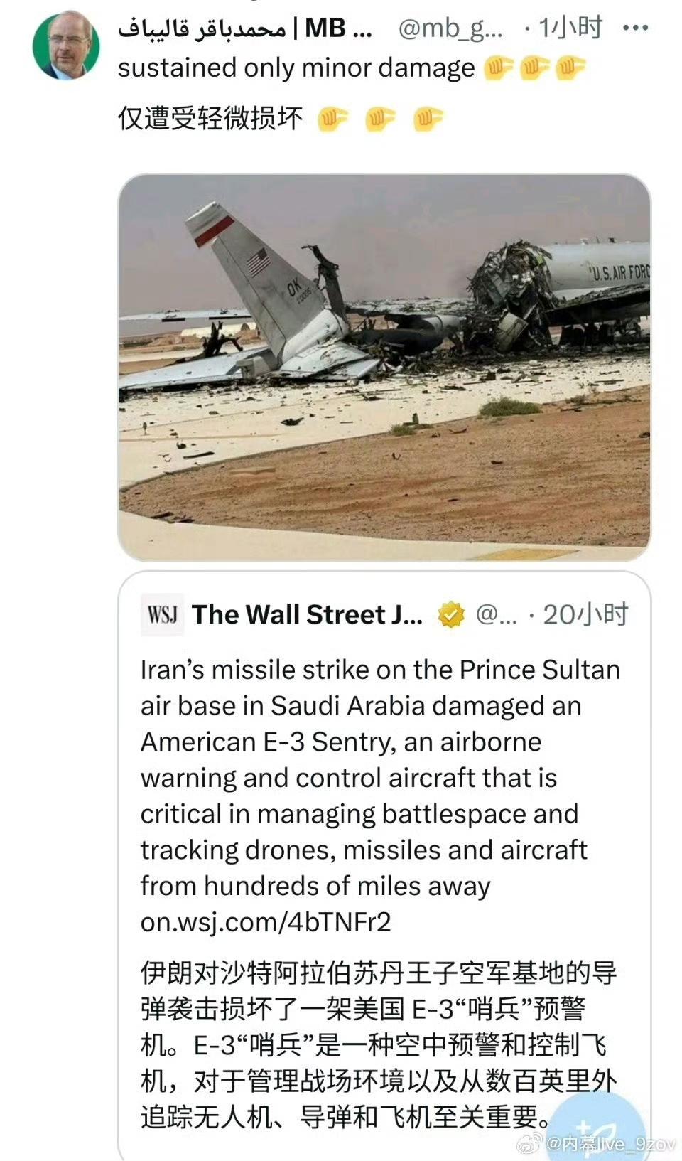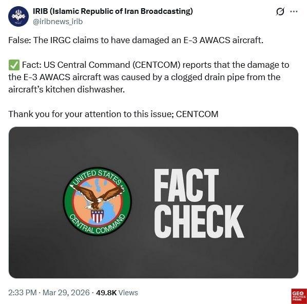 波斯亲自下场“帮漂亮国辟谣”。直接照搬M军常用的事实核查格式,一本正经胡说:网传E-3被导弹击中?假的!其实是机上洗碗机排水管堵了才出问题。 这波反向玩梗堪称绝杀,既嘲讽了M军一贯的甩锅套路,又把损失坐得明明白白。一架天价预警机,最后被波斯用一个厨房梗送上热搜,M军面子里子全丢光,属实是军事没输,舆论更赢麻了。