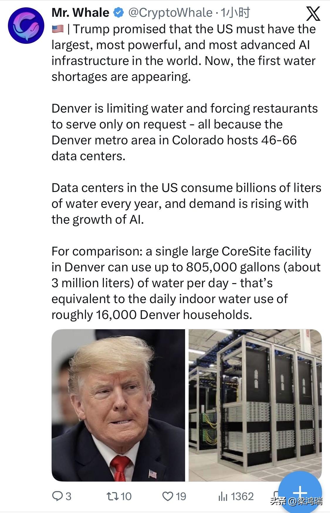 特朗普曾承诺美国必须拥有世界上规模最大、功能最强大、最先进的人工智能基础设施。如今,首批水资源短缺问题已经出现。 丹佛市正在限制用水,并强制餐馆只在接到请求后才提供用水——这一切都是因为科罗拉多州丹佛都会区拥有 46-66 个数据中心。 美国的数据中心每年消耗数十亿升水,而且随着人工智能的发展,用水需求还在不断增长。 相比之下:丹佛一家大型 CoreSite 工厂每天用水量可达 805,000 加仑(约 300 万升)——这相当于大约 16,000 个丹佛家庭的日均室内用水量。