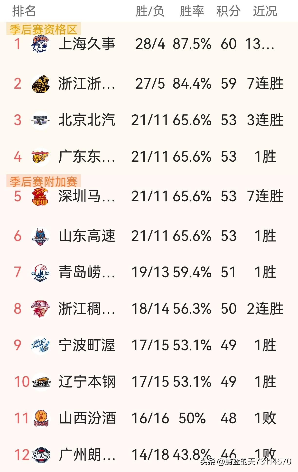 [玫瑰][玫瑰][玫瑰][玫瑰]CBA常规赛共42轮,还剩10轮。第32轮战罢,上海久事、浙江广厦、北京北汽、广东东阳光.,深圳马可波罗、山东高速、青岛崂山啤酒、浙江稠州、宁波町渥、辽宁本钢和山西股份、广州朗肽海本,暂排积分榜前十二名。 看了这个排名,个人认为: 1,晋级季后赛十二强的队应是八九不离十了。 2,常规赛四强,上海久事和浙江广厦应锁定前两名,后两名则应在北京北汽、广东东阳光、深圳马可波罗和山东高速这四支队中产生。 3,CBA联赛,浙江和广东各有三支球队参赛,战绩喜人,全部都有希望打入季后赛十二强。 4,宁波町渥男篮是本赛季进步最大的球队,目前17胜15负,暂排第9名(上赛季总46轮10胜36负,排名第17)。 5,常规赛和季后赛总冠军,极大概率会在上海久事和浙江广厦之间产生。