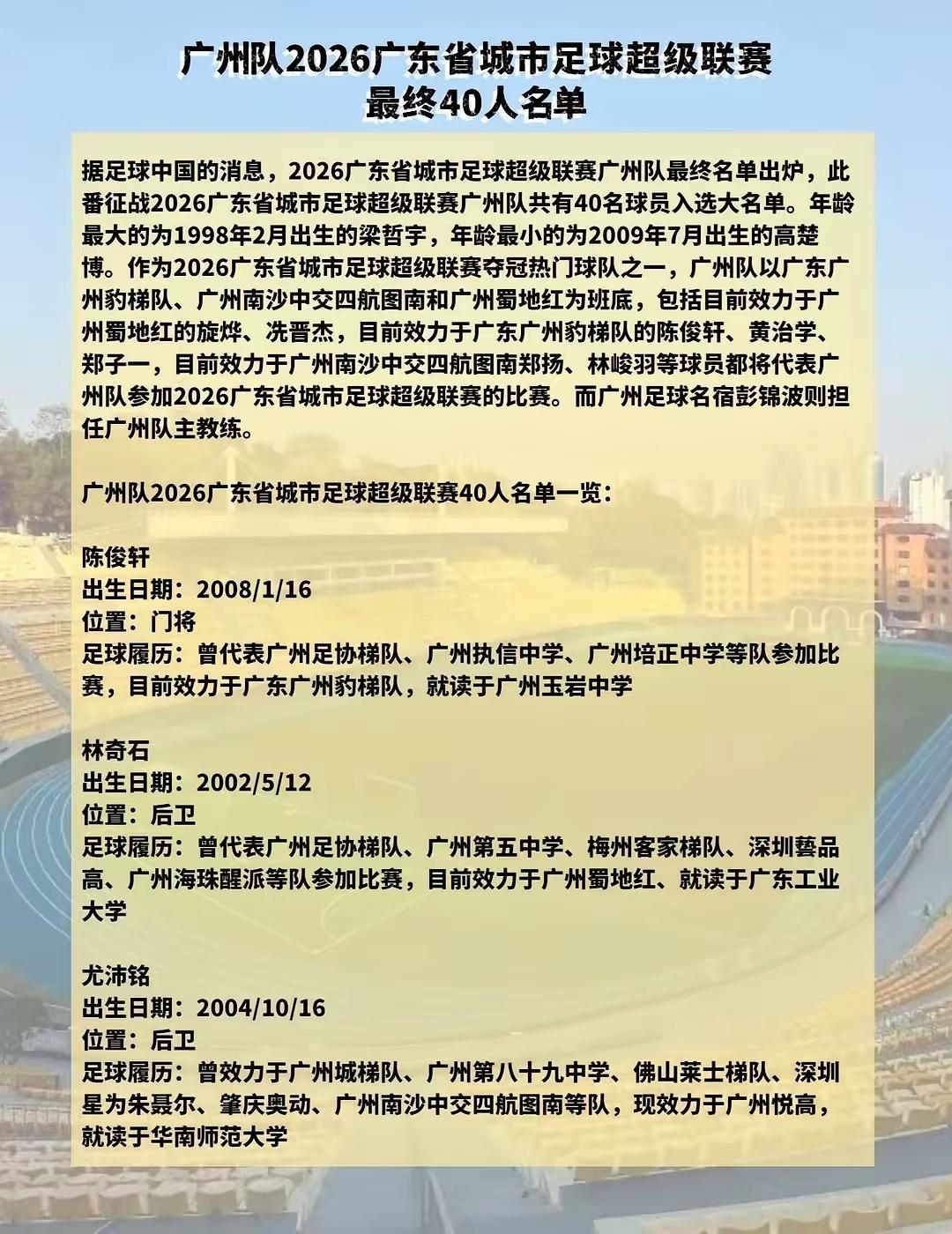 2026广东省城市足球超级联赛广州队名单出炉,年龄最小的是2008年年龄最大的是1998年,大部分的球员都是0607年的,我是坚决支持使用年轻人,因为年轻人才有发展前途才有希望,期待这些年轻人在舞台平台上得到锻炼和发展,中国足球落后的就是一群养老院的人,长期占据中国足球主力阵容不肯退,40几岁了还打国家队这样的球队有什么前途,中国足球应该建立一个30岁退休的制度,长江前浪推后浪足球,这个行业在更新迭代应该加快。要不然大量的年轻人得不到上场的机会就会被淘汰。 我非常支持广州的使用年轻人,支持彭景波这个主教练,彭教练是非常有水平而且职教比较严格有杀气的一个主教练,也希望广州队取得良好成绩….