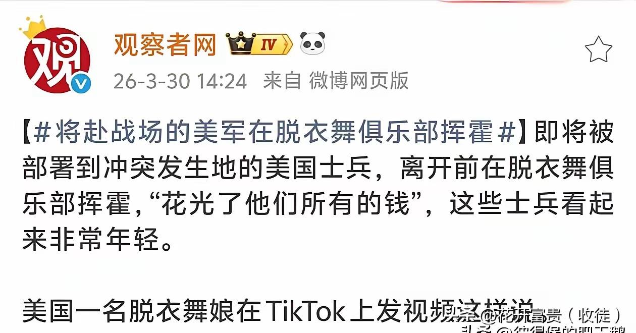 美军大兵疯挥霍:月薪全砸应召女与脱衣舞娘,一分不剩 号称世界最强的美军,底层大兵的生活,早已不是光鲜的军旅剧,而是满是绝望的沉沦闹剧,美军内部最新调查报告,直接撕开了最不堪的一面。 驻中东、日韩、欧洲的基层美军,月薪大多在2000-3500美元,除去基础伙食和日用品开销,剩下的钱,竟有超七成全都砸在了驻地的脱衣舞俱乐部、应召女身上,不少士兵发薪不过三五天,就把当月军饷造得一分不剩,甚至刷爆军牌信用卡、借高利贷,最后穷到连烟都买不起。 有驻伊拉克美军老兵爆料,军营周边的声色场所,一到周末全是美军士兵,脱衣舞娘的小费、应召女的开销,成了他们唯一的精神寄托。这些年轻士兵大多十八九岁,被派驻到海外战区,每天活在空袭和袭击的恐惧里,看不到任务意义,也看不到未来,没有家人陪伴,没有精神支撑,只能靠极致的放纵麻痹自己,逃避压得人喘不过气的绝望。 美军军方明明知晓乱象,却从未真正管控,甚至默许这类场所开在军营周边,当成安抚士兵情绪的“工具”。久而久之,越来越多士兵陷入恶性循环,服役期间攒不下一分钱,退役后要么负债累累,要么染上毒瘾、酒瘾,根本无法回归正常生活,每年都有上千名美军士兵,因此走向自杀或犯罪的绝路。 大家如何看待?欢迎评论区聊聊。