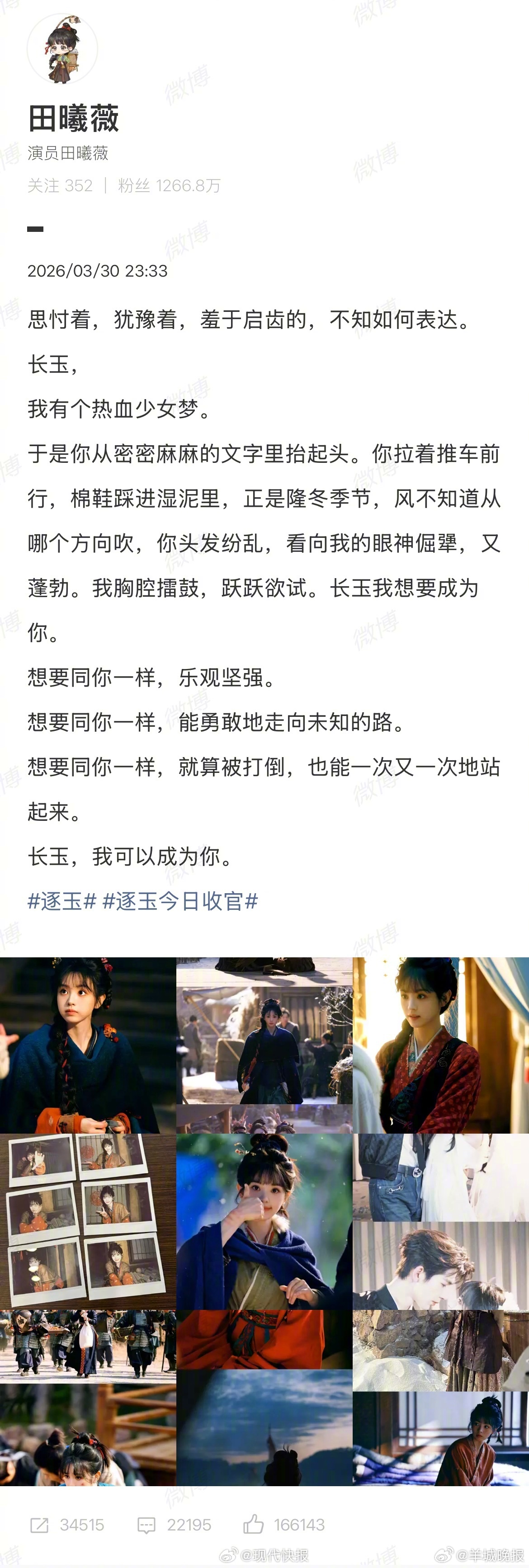 #田曦薇发了逐玉收官小作文#近日,电视剧《逐玉》收官。3月30日晚,主演发文: