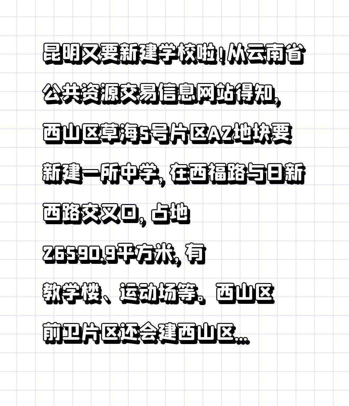 昆明又要新建学校啦!其中新建2所中学,位置分别在→ 从云南省公共资源交易信息网站得知,西山区草海5号片区A2地块要新建一所中学,在西福路与日新西路交叉口,占地26590.9平方米,有教学楼、运动场等。西山区前卫片区还会建西山区双塔中学(一期),周边有儿童医院、佳湖新城等。 另外,官渡区也有动作。巫家坝建设发展公司发布招标计划,要新建一所18班小学和一所30班的九年一贯制学校。小学在广福路以南,周边小区成熟;九年一贯制学校在巫家坝片区,能满足当地孩子上学需求。这些新学校的建设,对昆明教育发展是好事! 学校